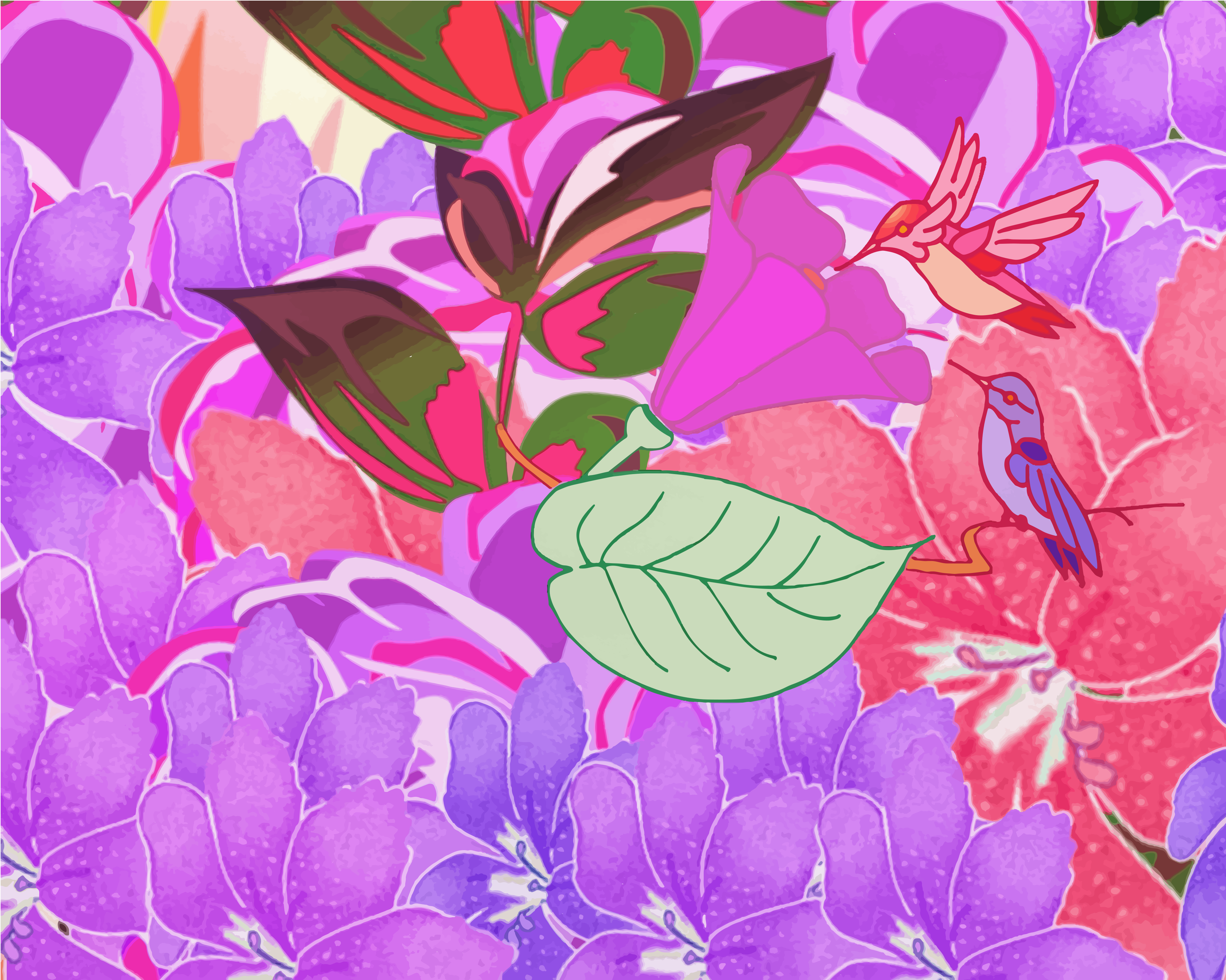 Tags: animal, bird, digital art, floral, flower, hummingbirds, illustration, leaves, hummingbird