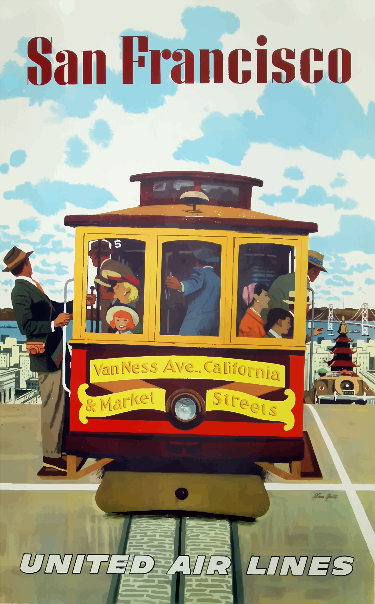 This is a vintage travel poster featuring a red and yellow trolley car with the words "United Air Lines" written on it. The trolley car is parked at a street corner, likely in San Francisco, as indicated by the title of the poster. Several people are visible around the trolley car, some standing closer to the front while others are further away. They appear to be waiting or preparing to board the trolley for their journey. The overall atmosphere of the image is nostalgic and inviting, showcasing a mode of transportation from a bygone era.