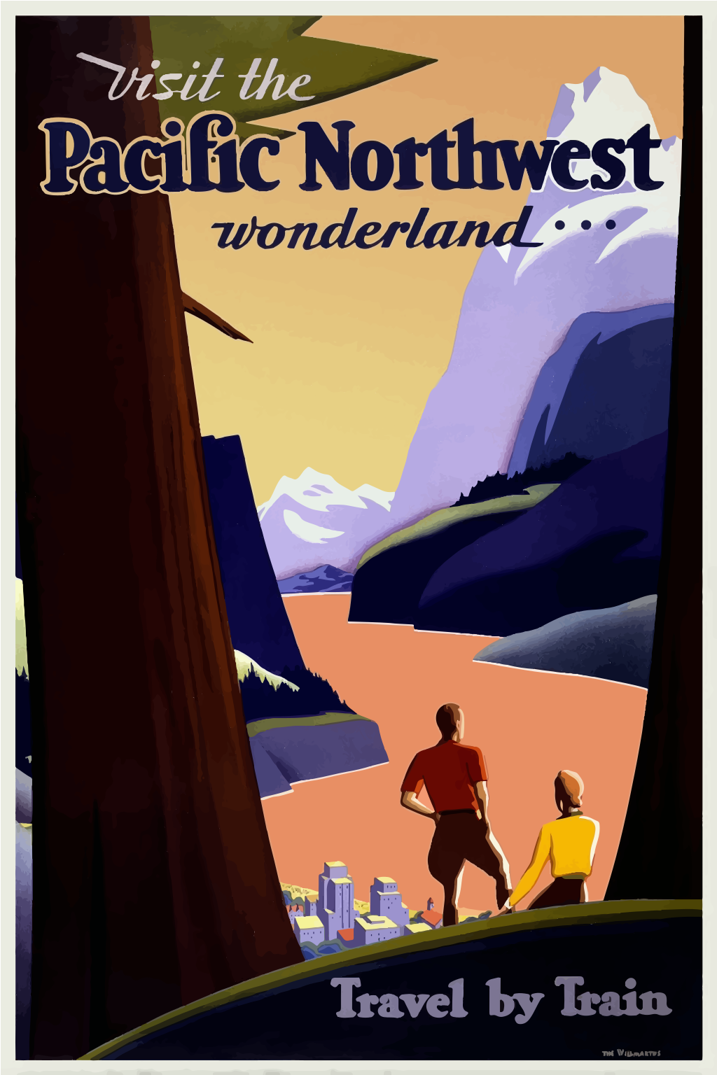 This features a colorful poster advertising the Pacific Northwest, specifically inviting people to visit the area. The poster is set against a backdrop of mountains and trees, creating an appealing visual for potential visitors. Two people are depicted on the poster, walking together in front of the picturesque landscape. They appear to be enjoying their time exploring the region, possibly taking a train journey through the scenic area. The overall atmosphere of the poster is inviting and encourages people to experience the beauty of the Pacific Northwest.
