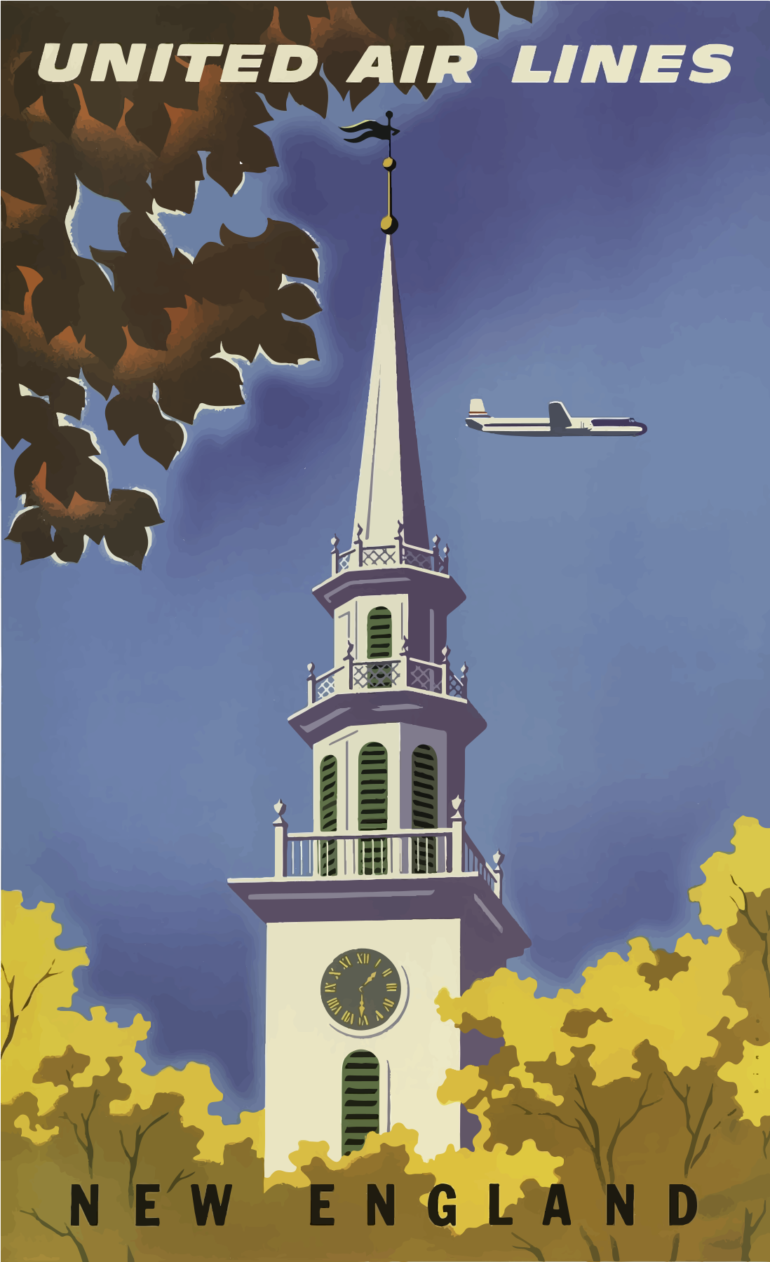 This is a vintage travel poster featuring an airplane flying over a church steeple. The scene takes place in New England, with the church tower prominently displayed in the foreground. Above the church, there are two airplanes visible, one larger and closer to the top of the poster, while the other is smaller and positioned slightly lower. The poster has a nostalgic feel, reminiscent of an earlier time when traveling by air was a novelty. The combination of the church steeple, the airplanes, and the New England setting creates a visually appealing composition that captures the essence of this iconic region in the United States.