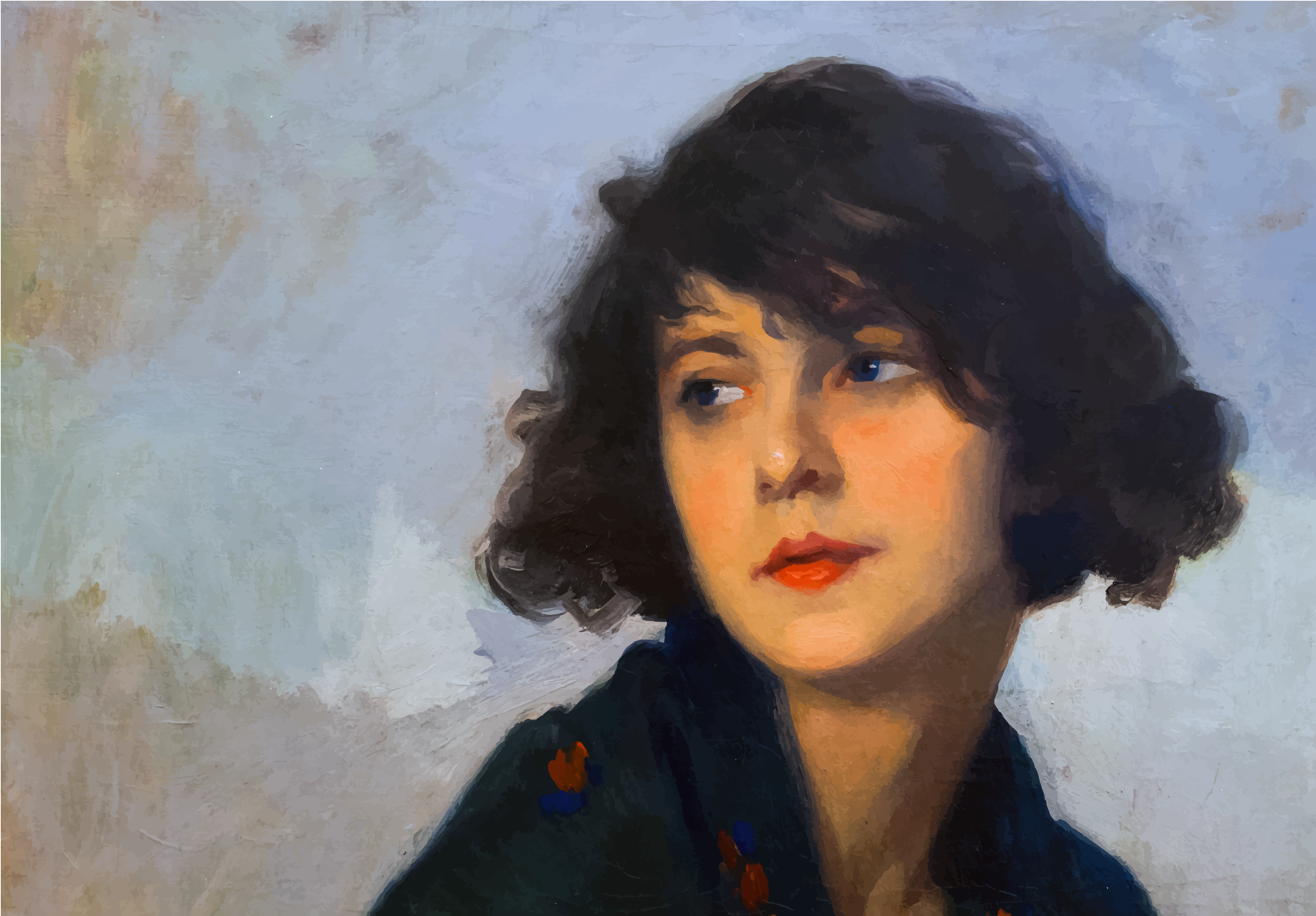 This features a woman with dark hair, wearing a black shawl and looking off into the distance. She has a pink lipstick on her lips, adding a touch of color to her appearance. Her gaze is directed towards something in the distance, possibly capturing her attention or curiosity. The painting showcases the woman's facial expression and features, creating an artistic representation of her emotions.