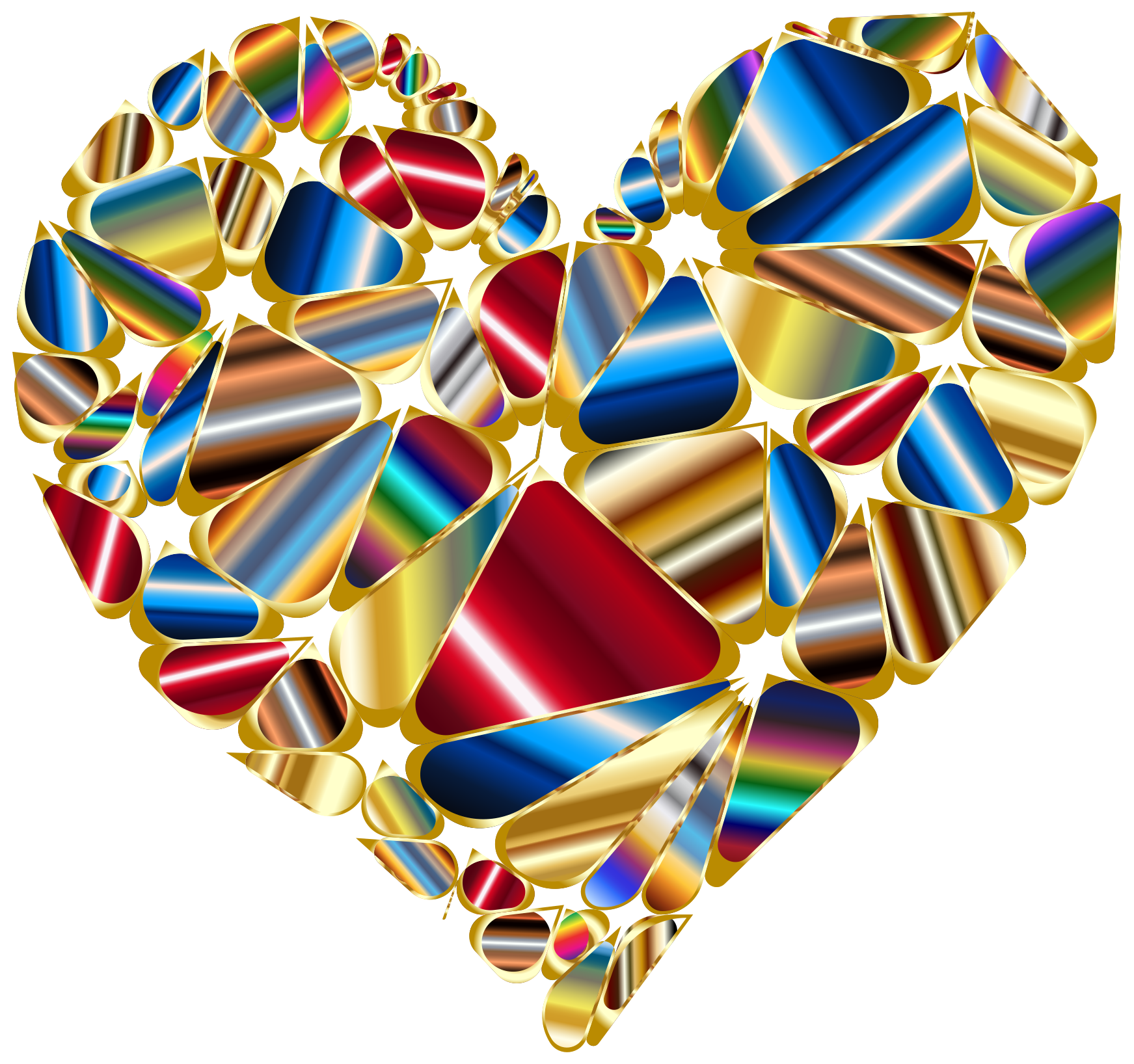 This features a heart made up of various colored and shaped pieces, including gold, red, blue, yellow, silver, and orange. These pieces are arranged in such a way that they form the shape of a heart, with some pieces overlapping each other to create depth and texture. The colors used in this artwork are vibrant and eye-catching, making it an attractive piece for display or decoration. The combination of different shapes and colors creates a visually appealing composition that showcases the artist's skill and creativity.