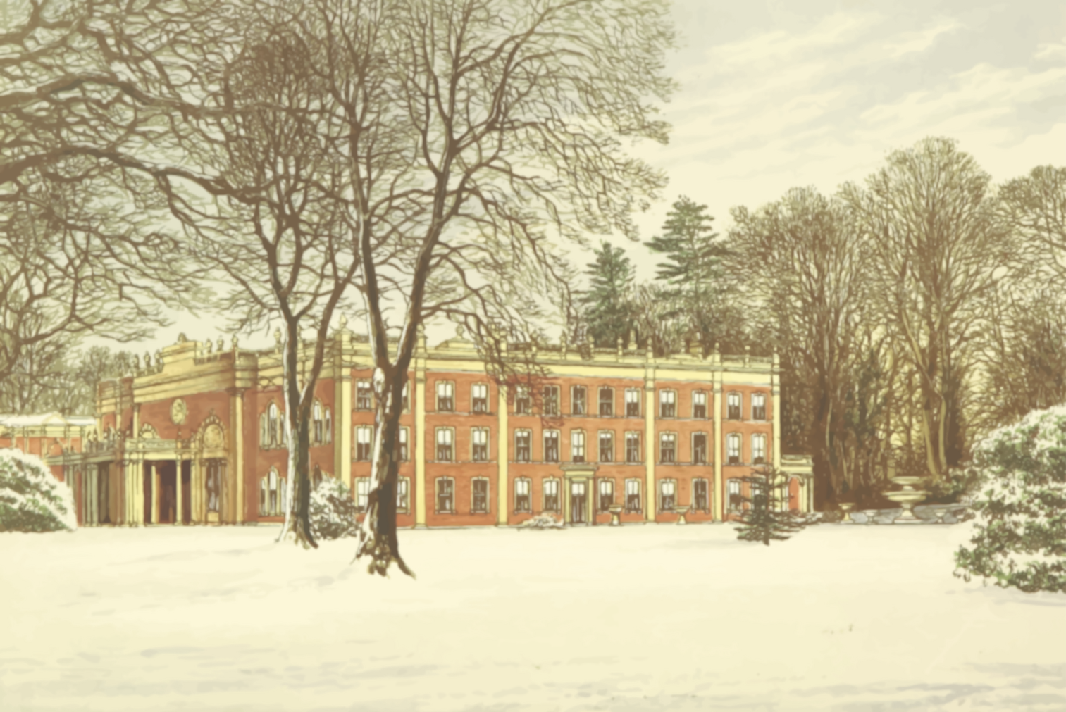 This depicts a large, snow-covered building with many windows. It is surrounded by trees and appears to be an old, historical structure. The scene takes place in a park setting where the building stands out as the main focal point. The combination of the building's architecture and the natural elements creates a picturesque winter landscape.