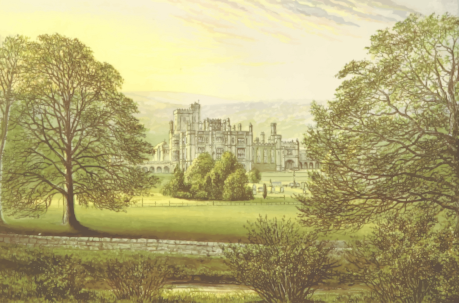 This features a large, old mansion situated in the middle of a grassy field. The mansion is surrounded by trees and appears to be an impressive structure with several windows. In addition to the main building, there are two smaller structures nearby, possibly outbuildings or other parts of the estate. A person can also be seen standing near the center of the scene, perhaps admiring the view or attending to some task on the property. The overall atmosphere suggests a peaceful and picturesque setting, with the mansion as the focal point of the landscape.