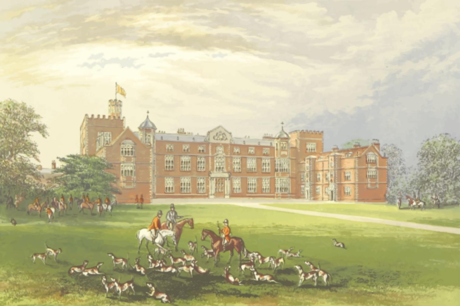This depicts a large, old-fashioned mansion with a castle-like appearance. It is surrounded by a lush green field and features a small path leading up to the entrance of the building. A group of people can be seen walking around the area, some closer to the mansion while others are further away. Among them, there are several dogs scattered throughout the scene, adding a playful element to the atmosphere. In addition to the people and dogs, there is also a horse present in the image, located near the center of the field. The combination of the majestic mansion, the greenery, and the presence of animals creates an idyllic and picturesque scene.
