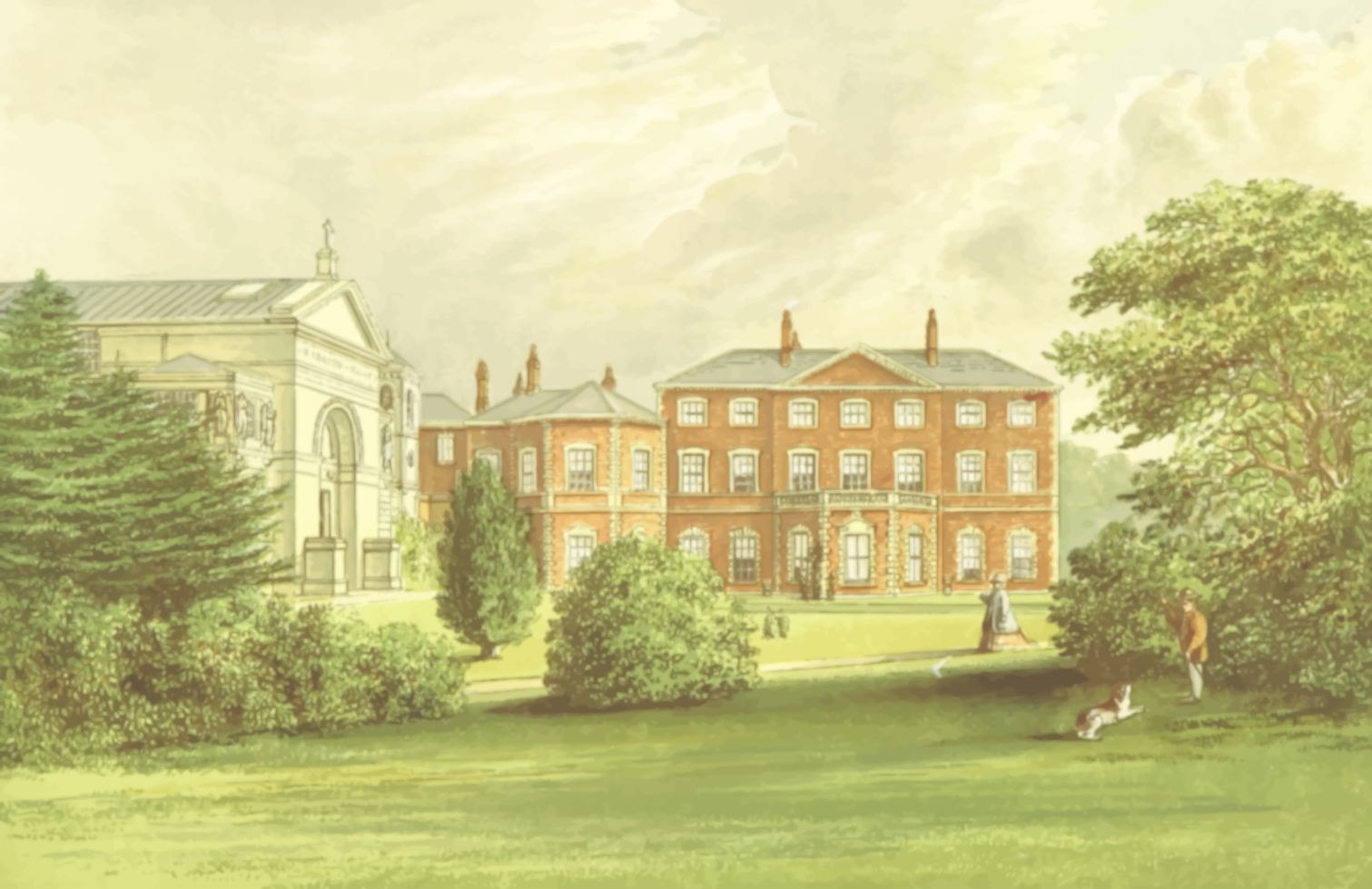 This is a painting of an old red brick building with white trim, surrounded by trees and grass. There are several people in the scene, some walking around the area and others sitting on the grass. A dog can be seen near one of the individuals, possibly accompanying them for a walk or playing fetch. The overall atmosphere appears to be that of a peaceful day at an old estate, with people enjoying their time outdoors.