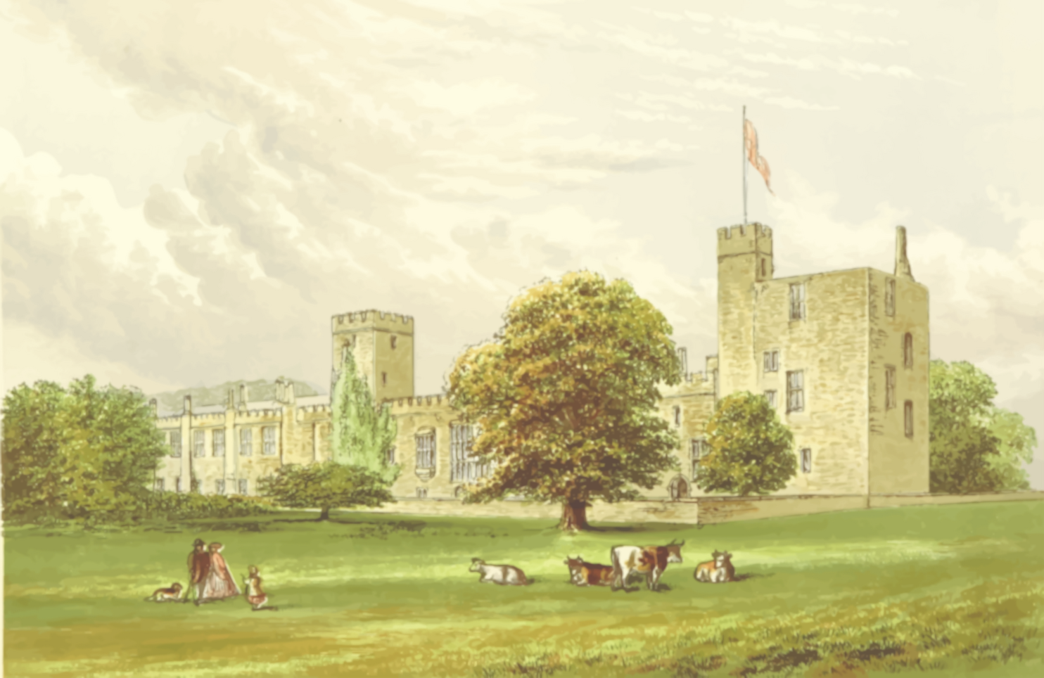 Tags: ancestral, ancestry, architecture, britain, building, castle, home, house, mansion, stately, uk, medieval, dog, cow, sheep, person, grassy field, castle sudeley