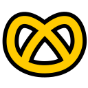 This features a yellow and black logo of two interlocking pretzel shapes. These pretzels are likely part of a bakery or food brand, as they are prominently displayed in the center of the logo. The design is simple yet eye-catching, with the bold colors making it stand out against any background. This type of logo could be used on packaging, advertising materials, or other promotional items to represent a bakery or food brand that specializes in pretzels.