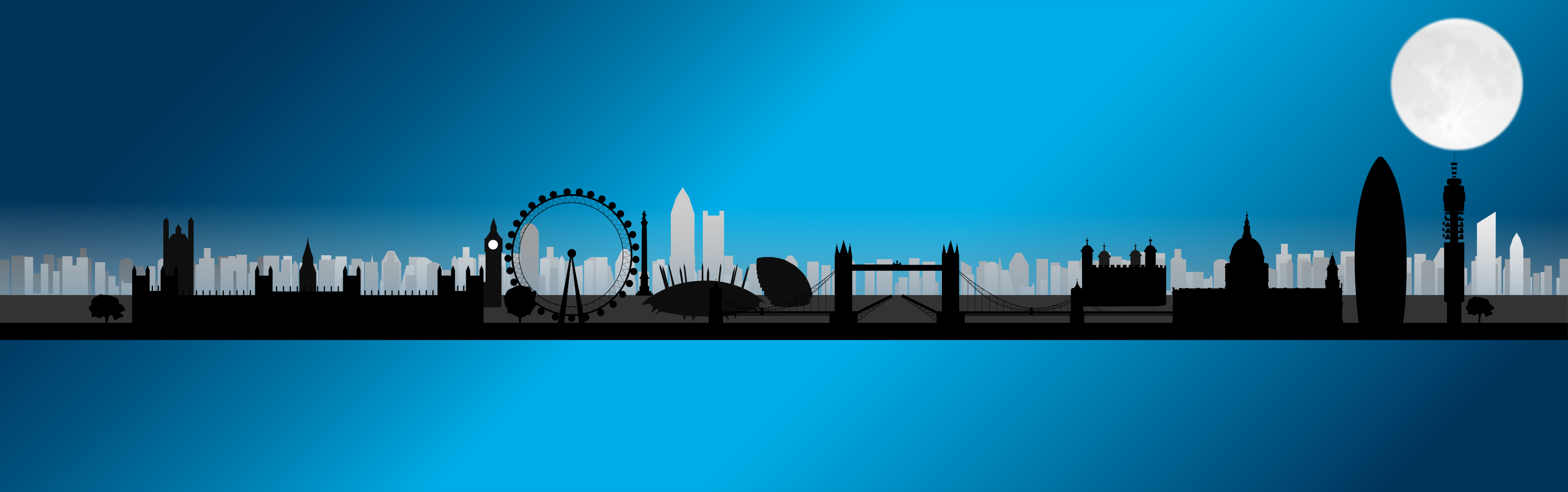 This features a beautiful cityscape at night, with the Ferris wheel of the London Eye lit up and towering over the city. The Ferris wheel is located in the center of the scene, surrounded by various buildings that create an impressive skyline. In addition to the Ferris wheel, there are several other smaller structures visible throughout the image, adding depth and detail to the urban landscape. The nighttime setting creates a serene atmosphere, with the moon rising above the cityscape, casting its soft glow over the scene. The combination of the illuminated Ferris wheel, the buildings, and the moon in the sky create an enchanting view that captures the essence of urban life at night.