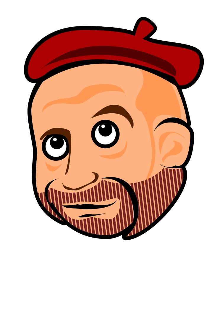 This features a cartoon drawing of a man with a red beret hat, giving him a distinctive appearance. He has a beard and mustache, adding to his unique look. His eyes are wide open, making the character appear surprised or curious. The man's facial expression is quite expressive, which adds to the overall charm of the cartoon drawing.