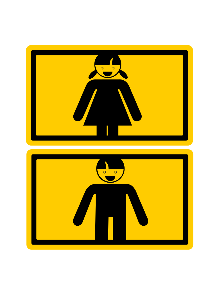 This features two identical yellow signs, each displaying a picture of a person. One sign shows a woman and the other displays a man. Both signs are placed side by side, with the woman's sign on the left and the man's sign on the right. The signs are positioned in such a way that they appear to be standing next to each other, creating an illusion of depth. This unique presentation of two identical signs can evoke curiosity about their purpose or meaning.