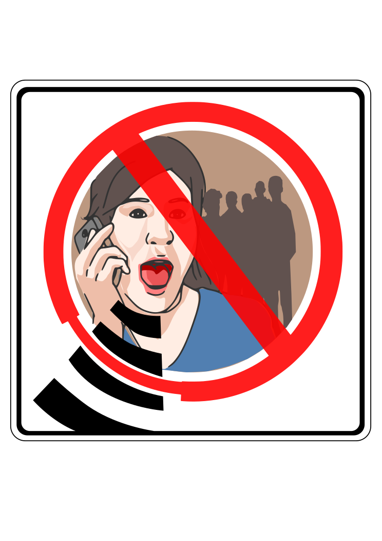 This features a red and white sign with an illustration of a woman talking on her cell phone. She is depicted as having her mouth open, possibly yelling or making a loud noise while using the phone. There are several other people in the background, but they appear to be smaller and less prominent than the main subject. The scene suggests that the sign might be warning against excessive use of mobile phones in certain areas or situations.