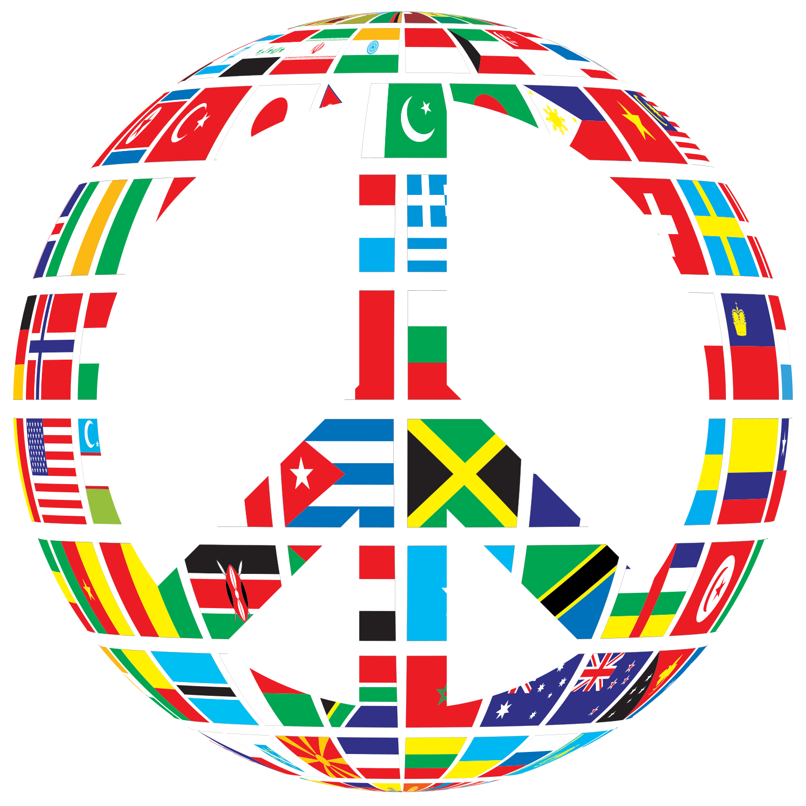 This features a large, colorful globe made up of various national flags from around the world. These flags are arranged in such a way that they form a peace sign, symbolizing unity and harmony among nations. The globe is filled with numerous flags, each representing different countries and their unique cultures. This artistic representation of the world's nations creates an eye-catching and visually appealing display, showcasing the diversity and interconnectedness of our global community.