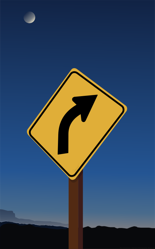 This features a yellow road sign with an arrow pointing to the right. The sign is placed on top of a wooden pole, and it stands out against the dark sky. In the background, there are mountains visible, adding depth and beauty to the scene. The moon can be seen in the upper left corner of the image, creating a serene atmosphere as night falls.