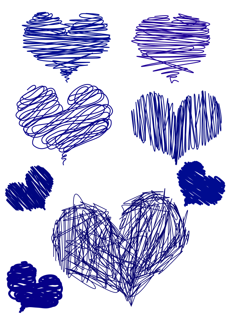 This features a collection of blue ink hearts, each with unique characteristics. Some of the hearts are filled with black lines, giving them an artistic and creative appearance. There is also a heart that has been crossed out, adding a sense of depth to the design. These hearts come in various shapes and sizes, making for an interesting and visually appealing display. The overall effect is one of playfulness and creativity, as if the hearts are being drawn by hand with a pencil or pen.