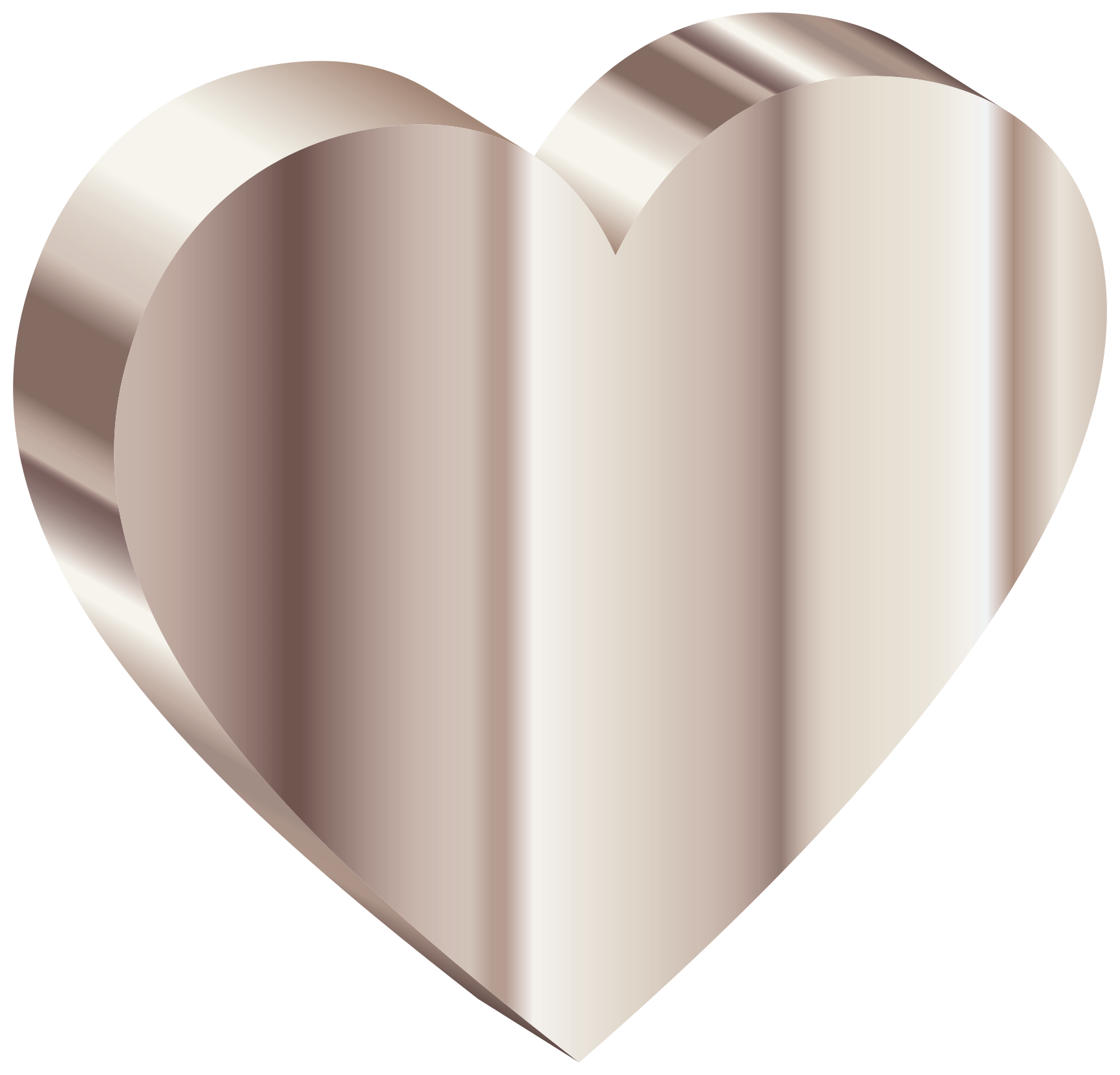 This features a heart-shaped object with a shiny, metallic appearance. It is a three-dimensional representation of the heart shape and has an appealing glossy effect that adds depth to its design. The heart's surface appears to be made of metal or another reflective material, giving it a polished look. This unique heart shape could be used as a decorative item or even as a gift for someone special.