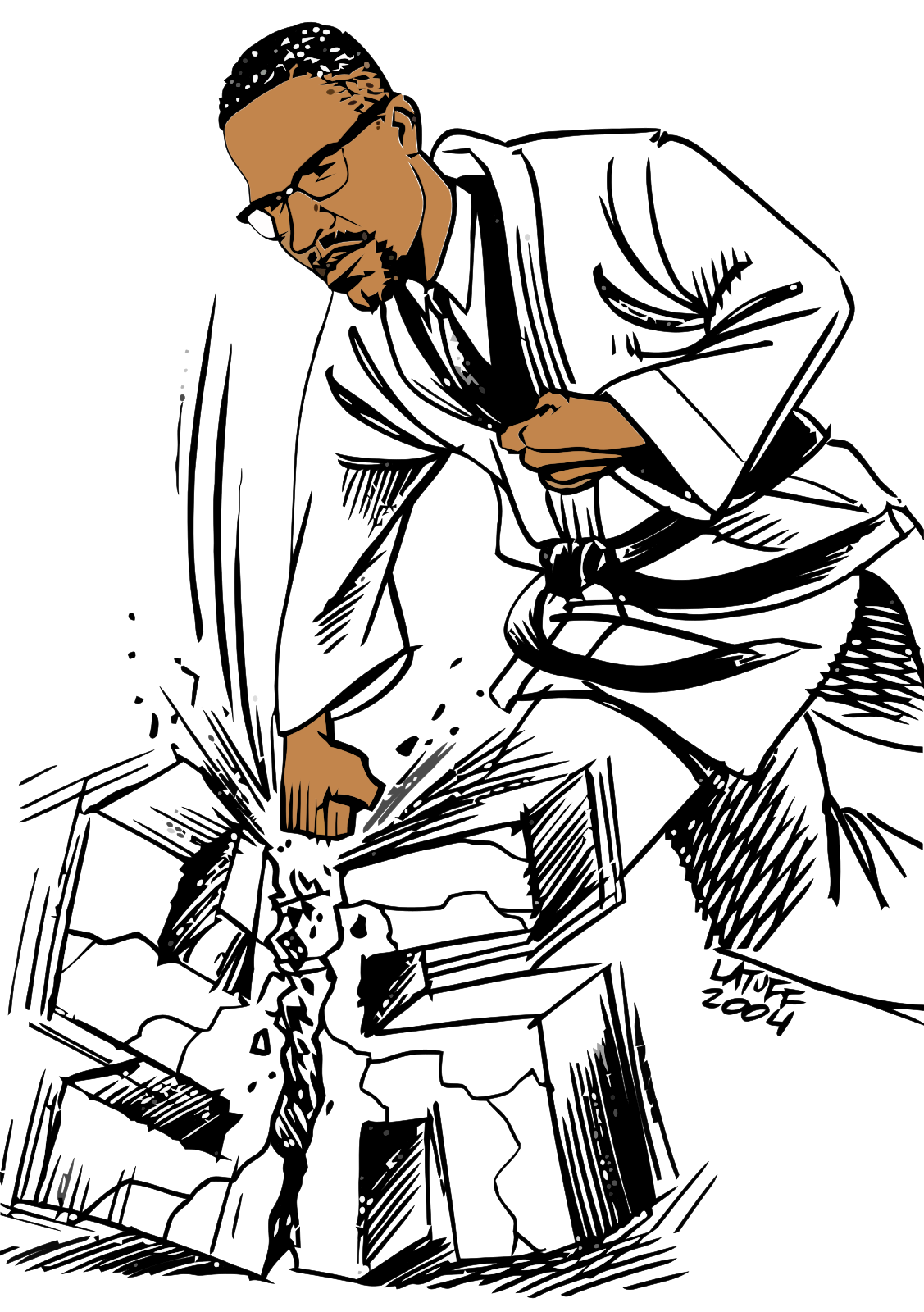 This features a man dressed in a white suit, standing and breaking a brick wall with his bare hands. He appears to be focused on the task at hand, demonstrating great strength and determination. The scene is depicted in black and white, giving it an artistic and dramatic feel.