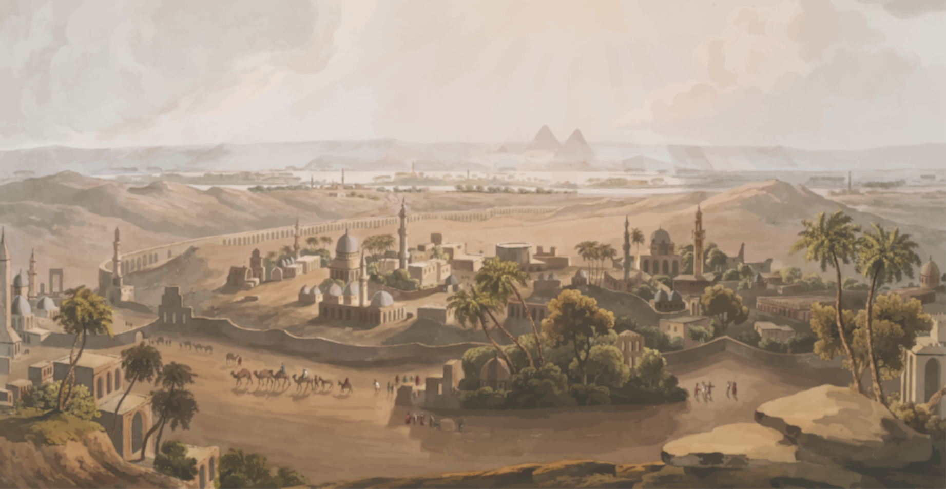 This is a painting of an ancient city, likely Cairo, with a large desert landscape in the background. The city is bustling with activity as people are walking around and riding horses throughout the area. There are several horses visible in various parts of the scene, some closer to the foreground while others are further away. The painting also features numerous buildings, including a castle-like structure that stands out among the other structures. The city is filled with people going about their daily lives, creating a lively atmosphere. Overall, this artwork captures the essence of an ancient city in the desert and its vibrant community.
