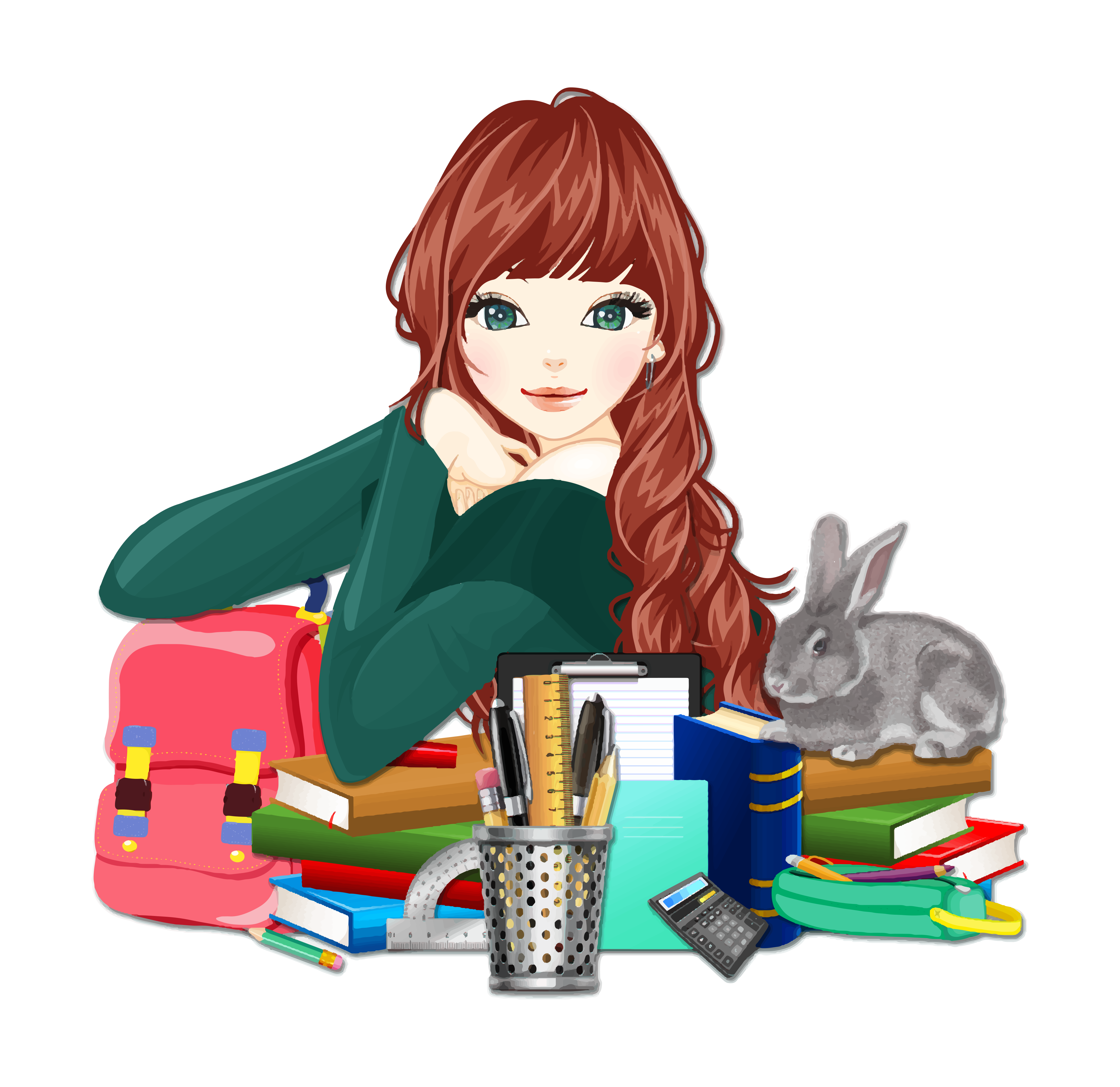 This features a woman with long red hair sitting on top of a pile of books. She is wearing a green shirt and has her hands resting on her chin, giving the impression that she is deep in thought or contemplating something. A bunny rabbit can be seen nearby, adding a playful touch to the scene. The books surrounding the woman are of various sizes and colors, creating an interesting visual display. There are also several other items scattered around the area, including a cup, a cell phone, a book, and a pair of scissors. The combination of these objects gives the impression that this could be a study or workspace where the woman spends her time reading, writing, or engaging in creative pursuits.