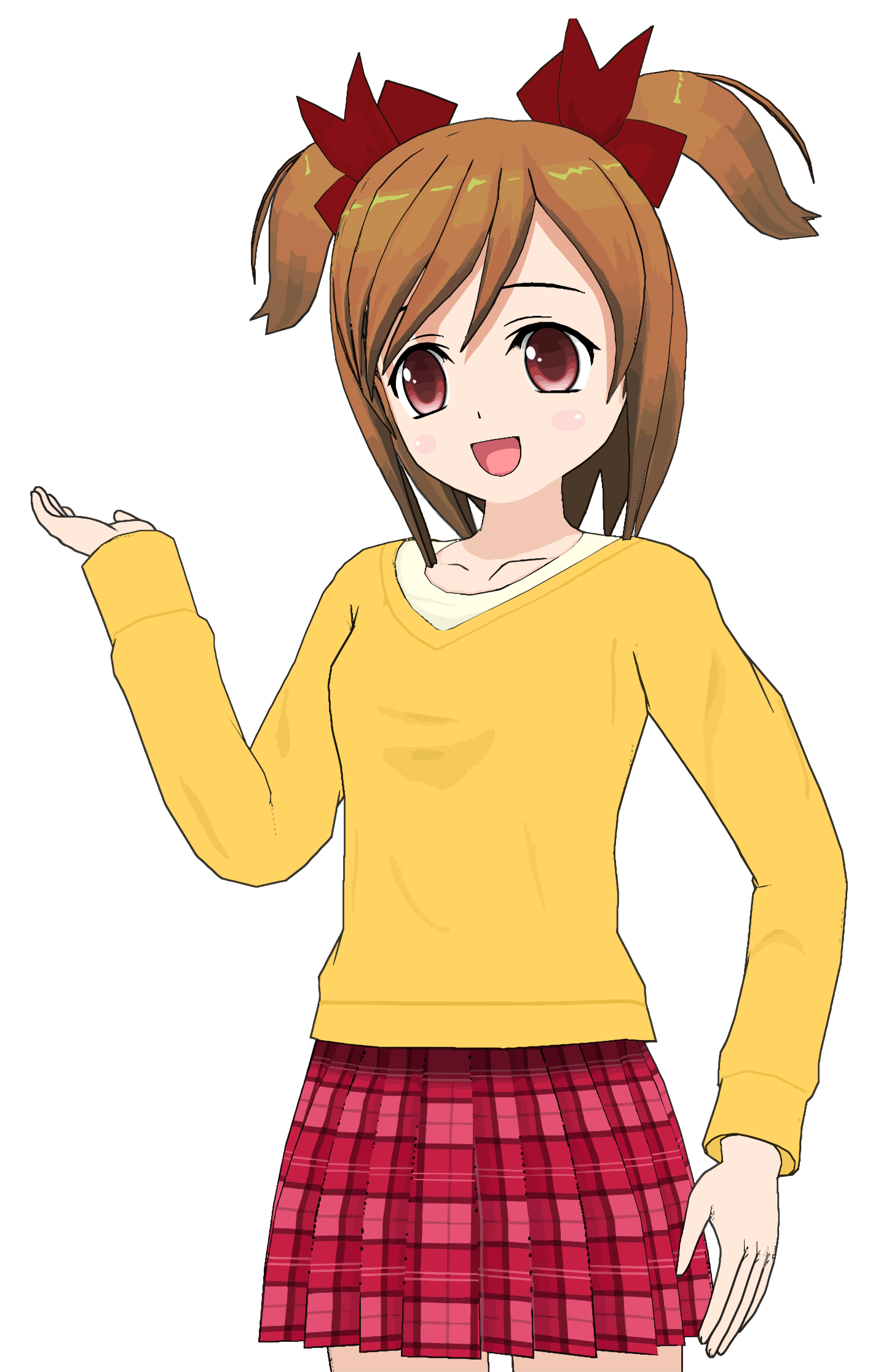 This features a cartoon character with long brown hair, wearing a yellow sweater and a red plaid skirt. She has her hand up to her mouth, possibly making a funny face or gesturing in some way. The character appears to be an anime girl, adding a playful and whimsical touch to the scene.