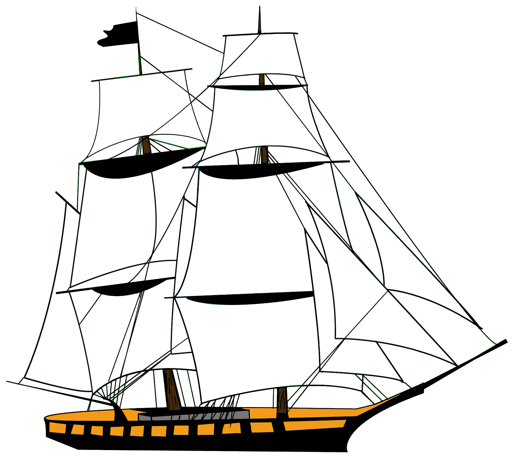 This features a large sailing ship with multiple masts and sails. It is an old-fashioned, three-masted schooner that appears to be floating on the water. The ship has a distinctive yellow hull, which stands out against the white background of the scene. The sails are spread across the ship's structure, with some positioned higher up and others lower down. This beautifully detailed illustration captures the essence of an old-time sailing vessel in action on the water.