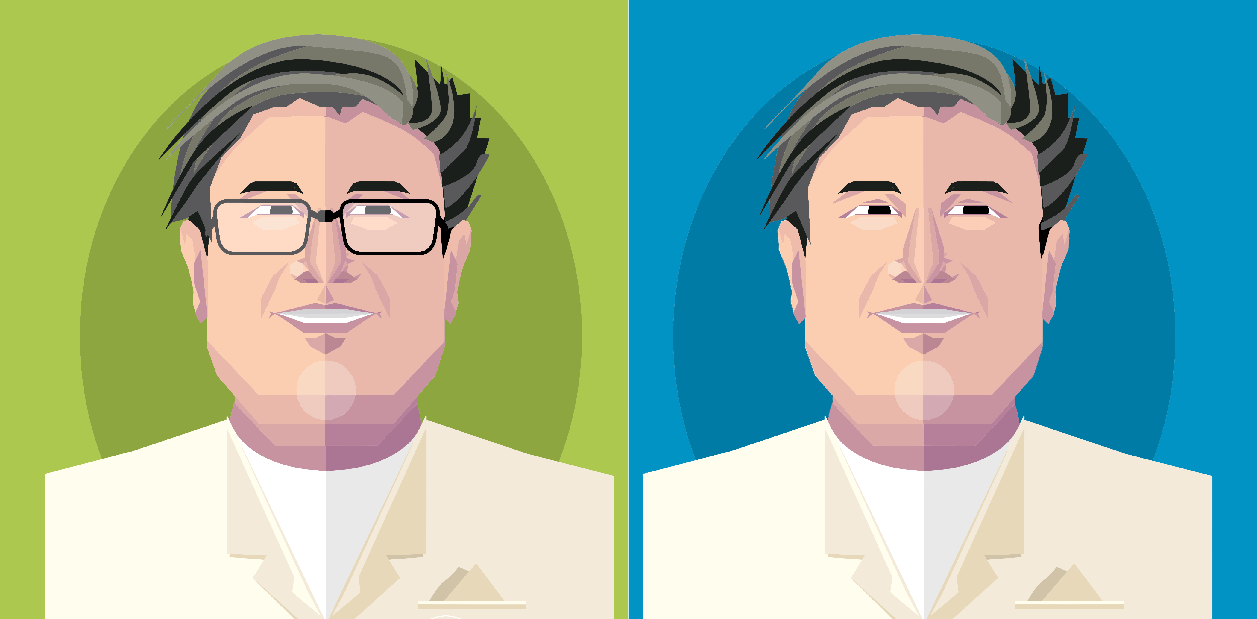 This features two side-by-side pictures of a man wearing glasses and a white shirt. In each picture, the man is smiling at the camera with his head turned to the side. The first picture has a green background, while the second one has a blue background. Both images are in color and showcase the man's pleasant expression as he poses for the photo.