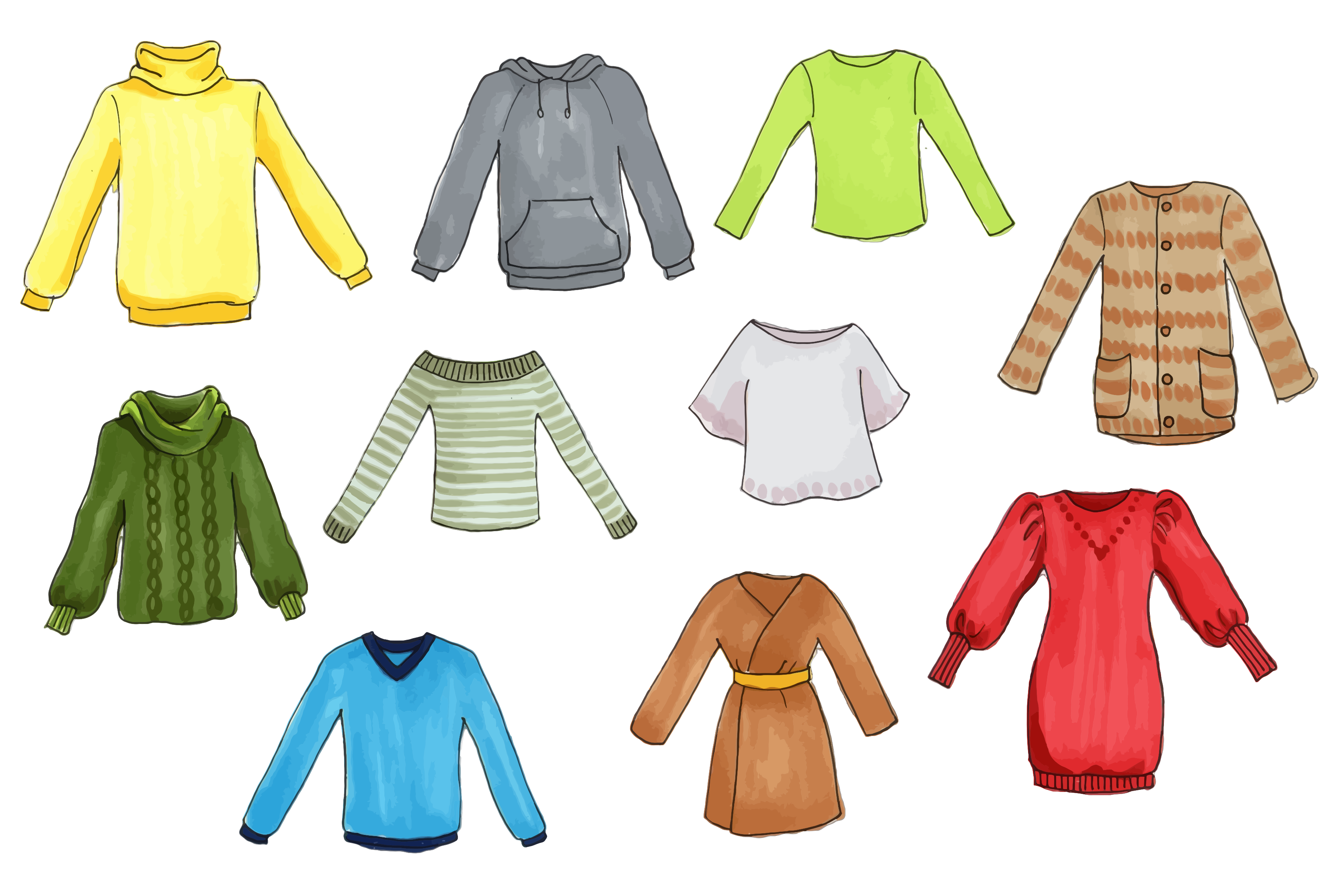 This features a collection of various clothing items, including sweaters and jackets. There are nine different colored sweaters in the scene, each with unique colors and patterns. These sweaters come in shades such as yellow, green, red, blue, brown, white, gray, and black. Additionally, there are six different colored jackets displayed, adding to the variety of clothing options available. The collection showcases a diverse range of styles and colors that can be worn for various occasions or personal preferences.