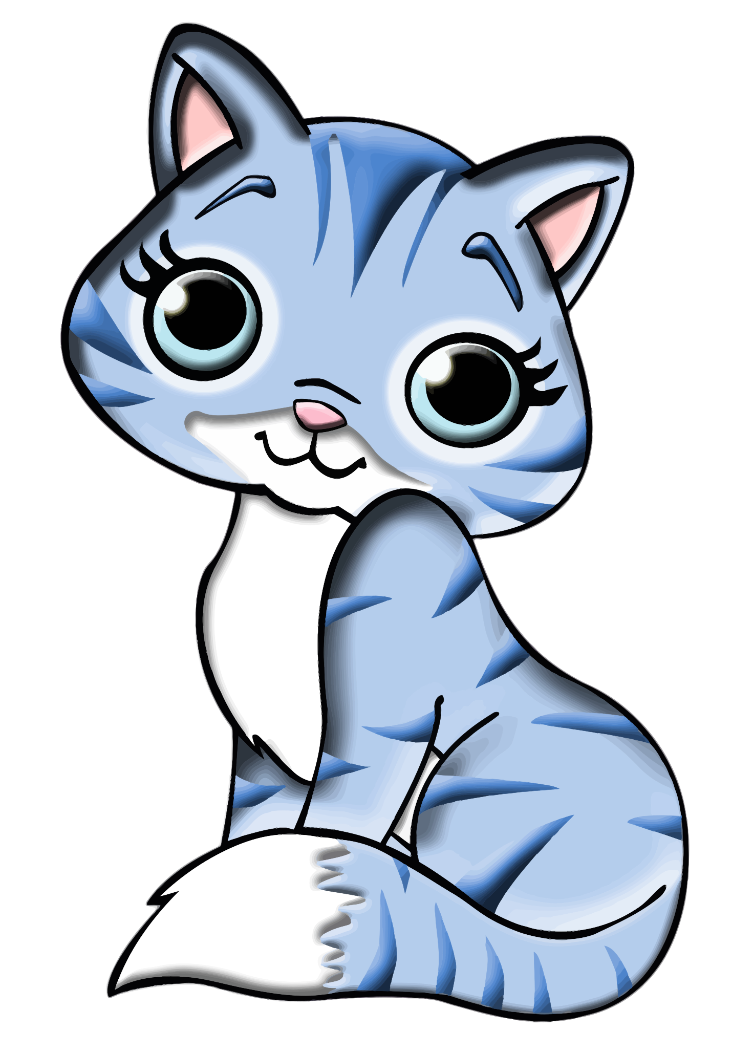 This features a cute cartoon cat with big eyes and a pink nose. It is sitting on the ground, posing for the camera. The cat has long whiskers and its fur is striped in blue and white colors. The cat's expression appears to be playful as it looks directly at the viewer. This illustration showcases the artist's ability to create a charming and adorable character that captures the attention of viewers.