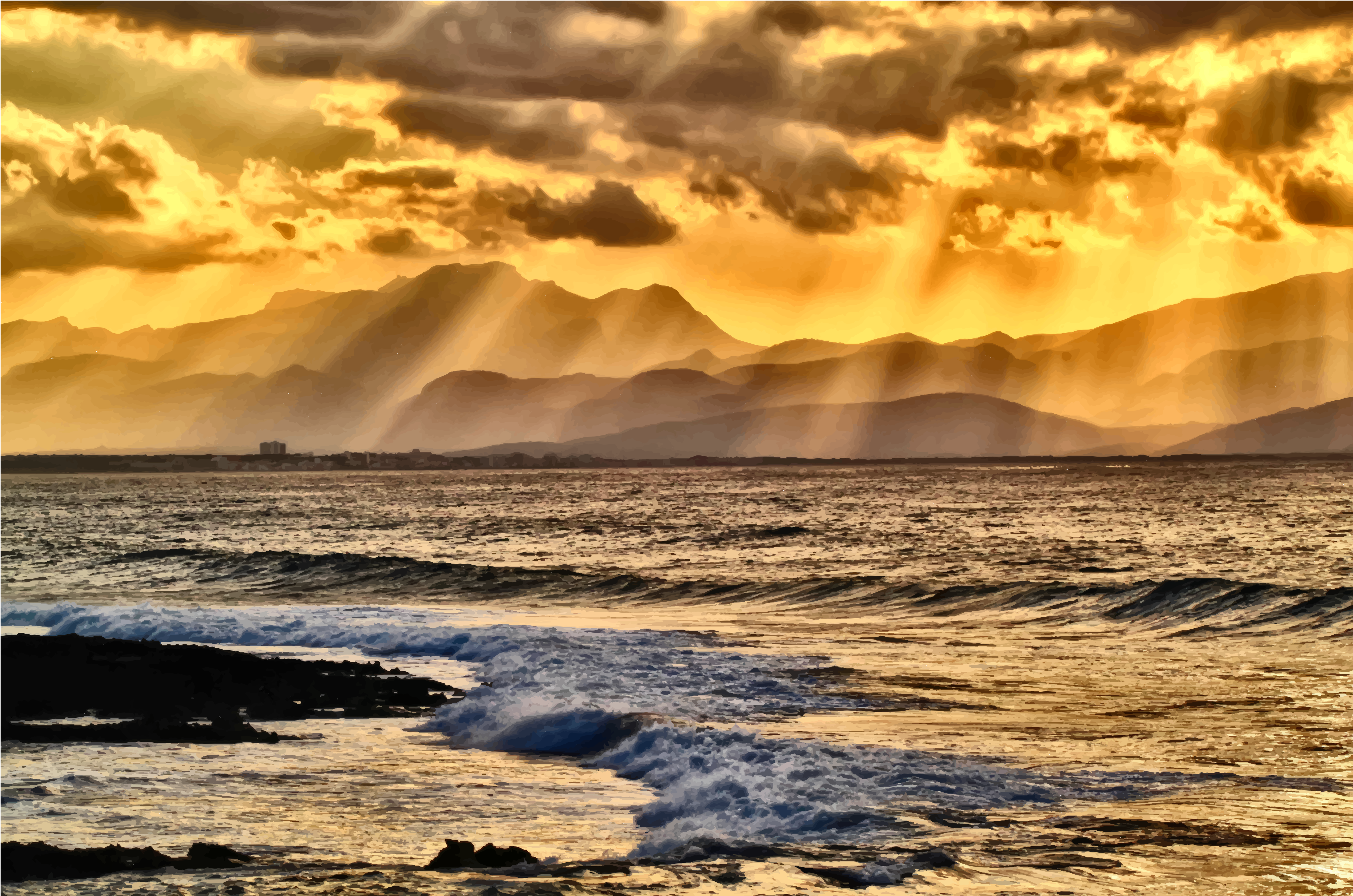 This captures a beautiful sunset over the ocean, with the sky filled with clouds and rays of light shining through. The scene is set on a beach where waves are crashing onto the shore, creating an idyllic atmosphere. In the distance, mountains can be seen rising above the horizon, adding to the picturesque view. The combination of the sunset, ocean, and mountain range creates a serene and tranquil environment that invites relaxation and contemplation.