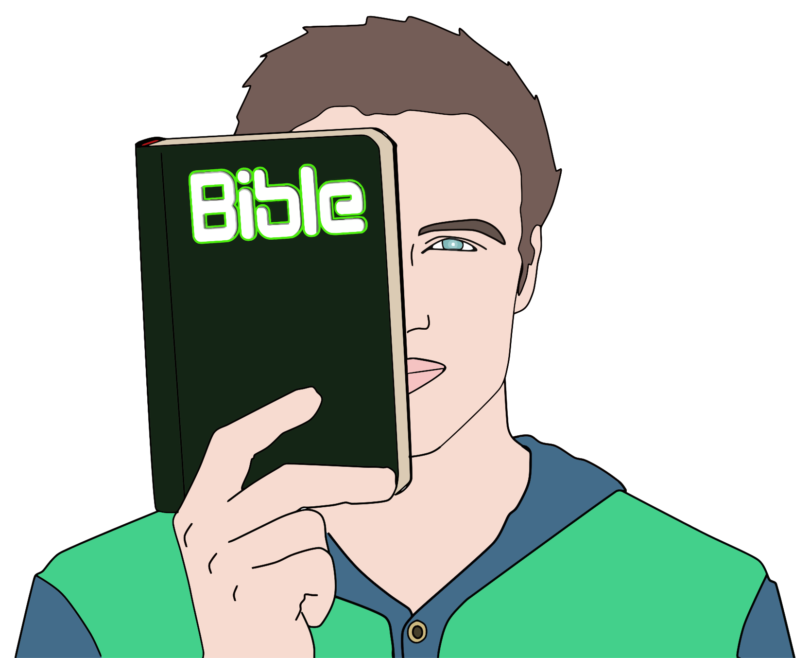 This features a man holding an open book, which is titled "Bible." He appears to be reading the book with great interest. The man's face can be seen in the reflection of the book cover, giving a sense of depth and perspective to the scene. The book itself occupies a significant portion of the image, covering almost the entire width of the frame.