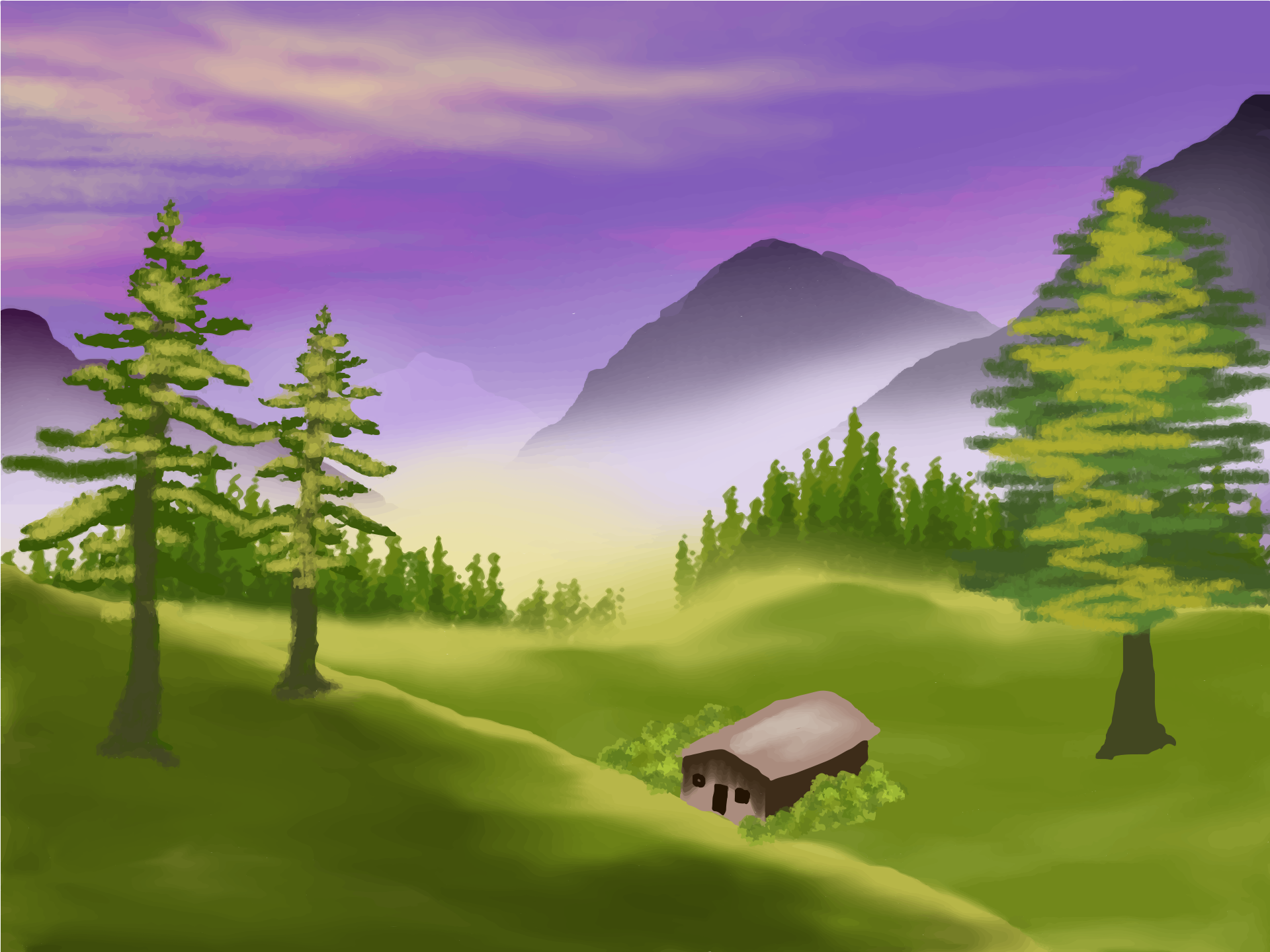 This depicts a serene scene of a small cabin nestled in the middle of a lush green valley. Surrounded by trees, the cabin appears to be a peaceful retreat from the hustle and bustle of everyday life. In the background, majestic mountains rise above the valley, creating an idyllic landscape that is both picturesque and inviting. The combination of the cabin, greenery, and mountain backdrop creates a sense of tranquility and harmony with nature.