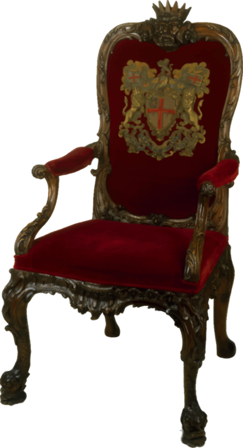 This features a large, ornate wooden chair with red velvet upholstery. The chair is adorned with a gold crown on top and has a red cushion on the seat. The chair's design suggests it could be an antique or a piece of furniture from a royal setting. The overall appearance of the chair gives off a sense of luxury and grandeur, making it an eye-catching centerpiece in any room.