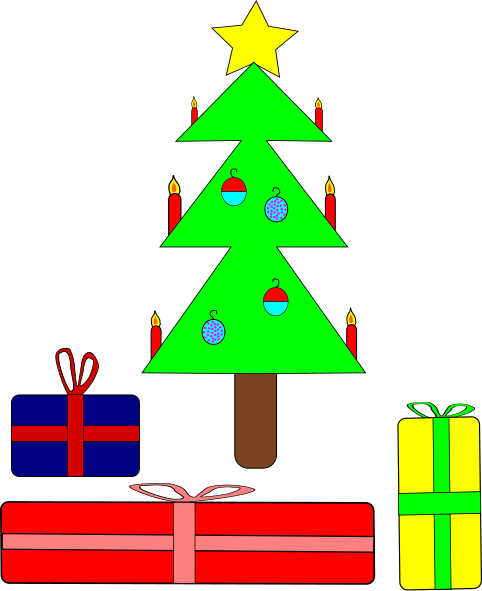 This features a Christmas tree with ornaments and candles on it. There are three presents placed under the tree, one to the left, another in the middle, and the third one to the right. The tree is adorned with various decorations such as stars, lights, and balls. The overall scene creates a festive atmosphere for the holiday season.
