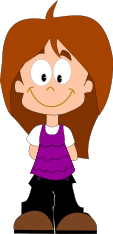 This features a cartoon character of a girl wearing a purple top and black pants. She is standing with her hands behind her back, giving off a playful vibe. Her smile adds to the cheerful atmosphere of the scene. The color scheme of the drawing includes brown hair for the girl and purple clothing, creating a visually appealing contrast.