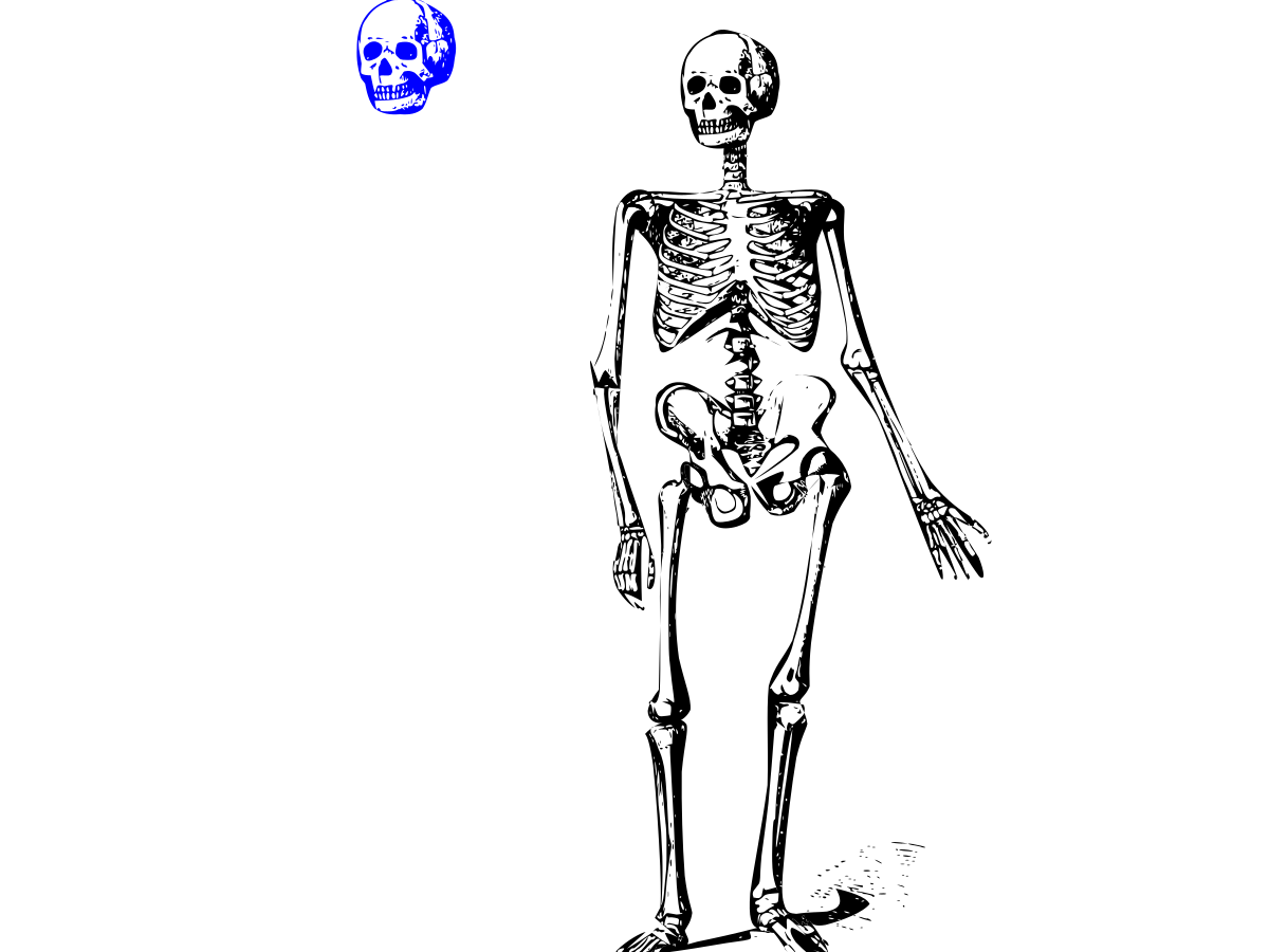 This features a skeleton standing in the center of the frame, with its arms outstretched. It appears to be posing for a picture or engaging in some form of activity. A skull is visible near the top left corner of the image, adding an interesting element to the scene. The overall composition creates a sense of motion and dynamism, as if the skeleton is actively participating in its surroundings.