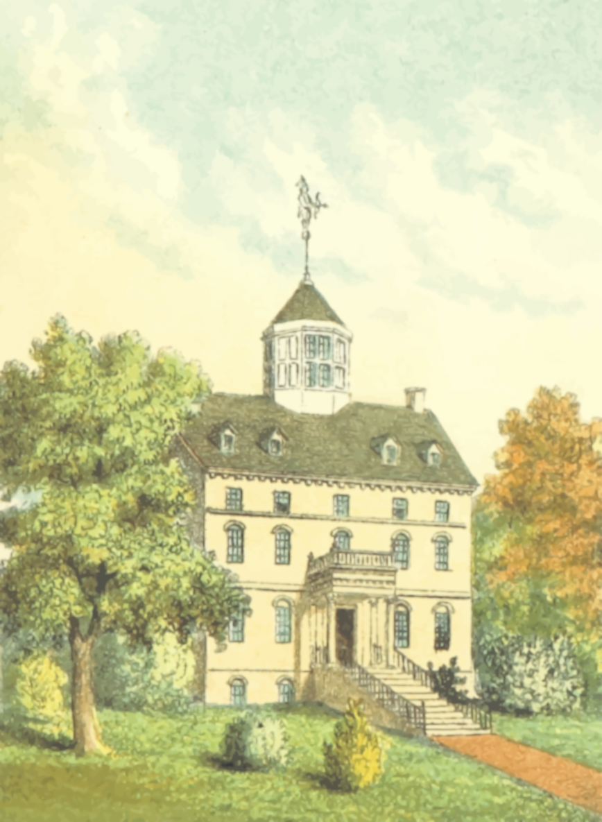 This features a large, white mansion with a blue roof and a clock tower. The house is surrounded by trees, giving it an elegant and serene appearance. In front of the mansion, there are steps leading up to the entrance, which is adorned with a beautifully designed doorway. Above the doorway, a weather vane can be seen, adding a touch of charm to the scene. The overall atmosphere suggests that this could be an old, historic building, possibly a castle or a stately home.