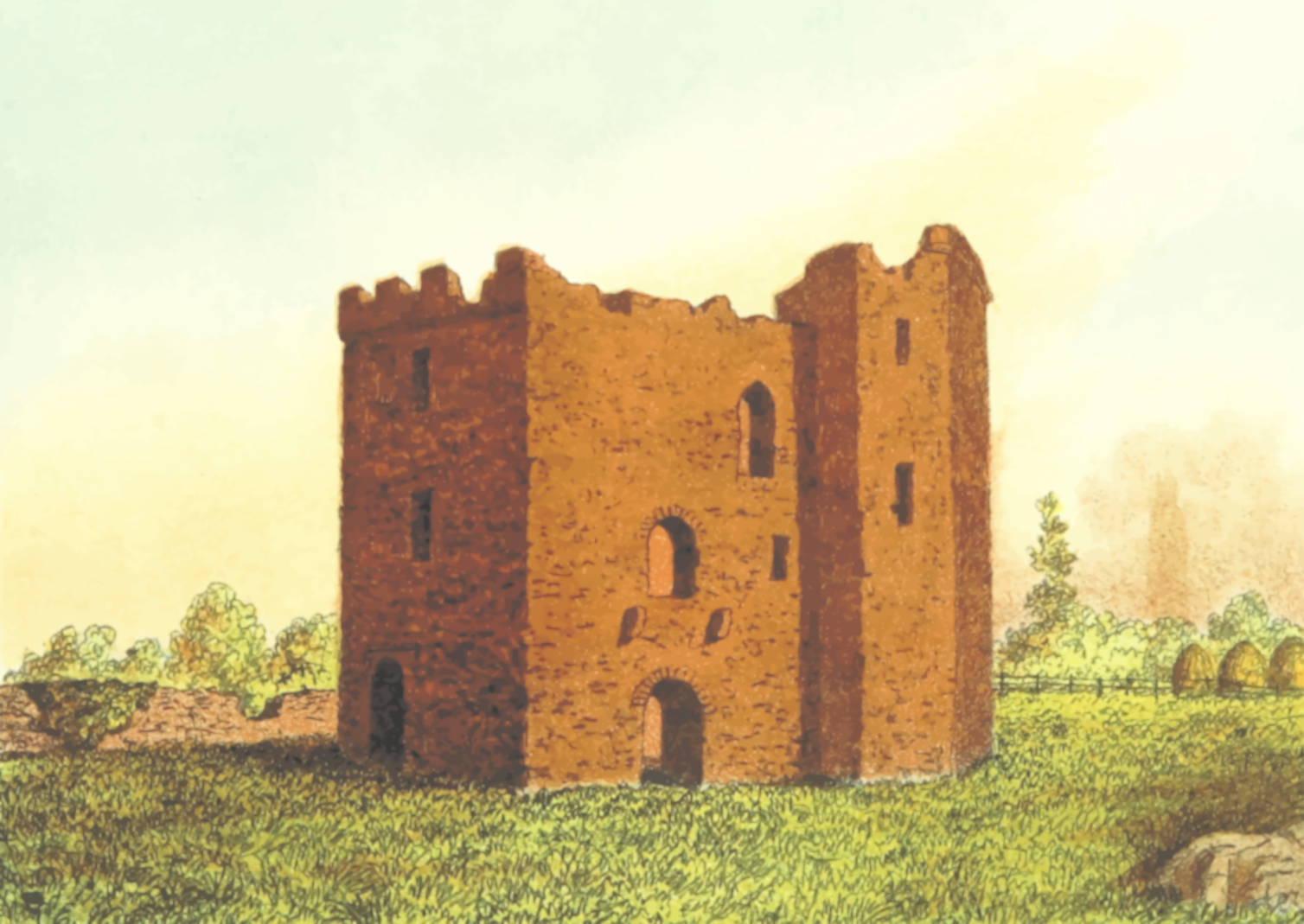 This features a large, old brick building with a castle-like appearance. It has several arched windows and an open doorway, giving it the look of a fortress. The structure is situated in a grassy field, which adds to its majestic presence. The overall scene appears to be a drawing or painting, capturing the essence of this impressive brick building.