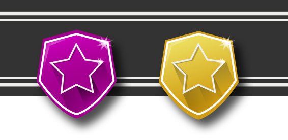 This features two star shields, each with a gold star in the center. They are placed side by side on a brown background. The left shield is pink and has a purple outline around the star, while the right shield is yellow and also has a purple outline. These shields appear to be decorative or symbolic, possibly representing a specific organization or event.