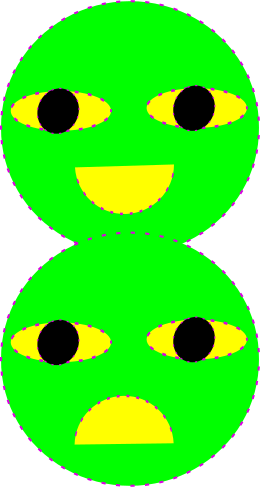 This features two green circles with yellow eyes and smiles on them. These circles are placed side by side, creating a visually appealing scene. Each circle has a different expression, one being happy and the other sad, adding contrast to the overall composition of the image. The colors used in this design create an interesting visual effect that captures attention and adds character to the artwork.