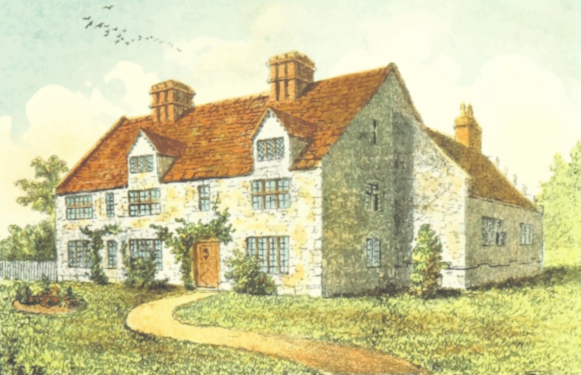This features a large, old-fashioned brick house with a red roof. It is situated on a grassy field and has a path leading up to it. There are several birds flying in the sky above the house, adding a sense of liveliness to the scene. In addition to the main building, there are two smaller houses visible in the background, one located further back and another closer to the foreground. The overall atmosphere is that of a peaceful countryside setting with a charming old home as its centerpiece.