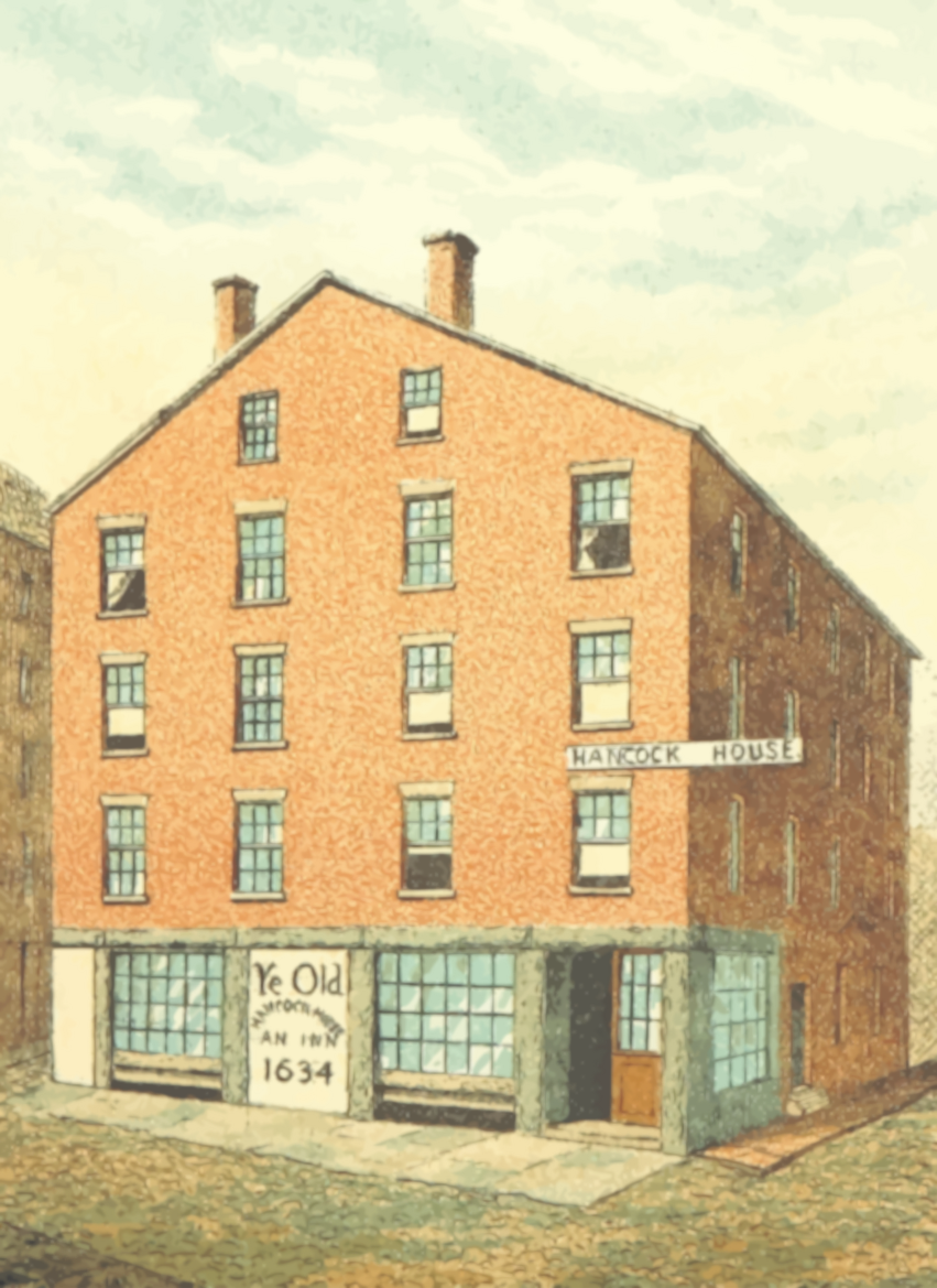 This features a large, old red brick building with white trim. It has many windows and is situated on the corner of a street. A sign can be seen in front of the building, possibly advertising an old hotel or inn. The building appears to have been drawn by hand, giving it a unique and artistic appearance.