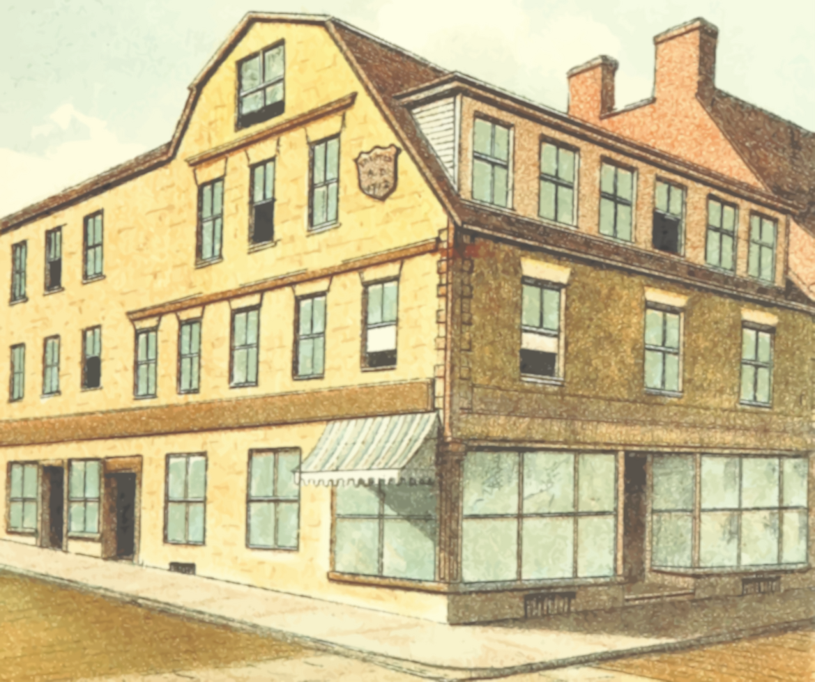 This is a drawing of an old-fashioned building with many windows. It appears to be a store or a house, as it has a large window in the front and several smaller ones on the sides. The building's exterior features a yellow brick facade, giving it a classic appearance. There are also two benches visible outside of the building, one located closer to the left side and another further back on the right side. This charming scene captures the essence of an old-fashioned town or city street corner.