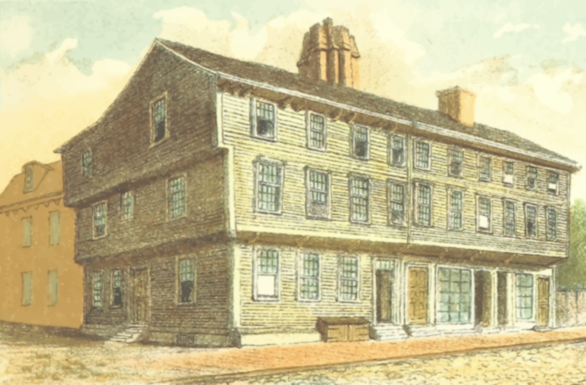 This depicts a large, old-fashioned building with many windows. It is situated on the corner of a street and appears to be an old mansion or a house. The building has a brown exterior and features several blue windows that add character to its design. There are also two chimneys visible on top of the structure, further emphasizing its historical charm. A bench can be seen in front of the building, providing a place for people to sit and enjoy the surroundings. The overall atmosphere suggests a quaint, charming neighborhood with a rich history.