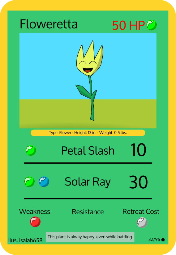 This displays a cartoon-like illustration of a flower with the words "Floweretta" written above it. The flower is depicted as a smiling face, and there are several numbers surrounding it. These numbers include 50 HP, 19 weight, and 30 strength. Additionally, there are two other numbers in the image: one at the top left corner and another on the right side of the illustration. The overall appearance suggests that this is a card or an advertisement for Floweretta.