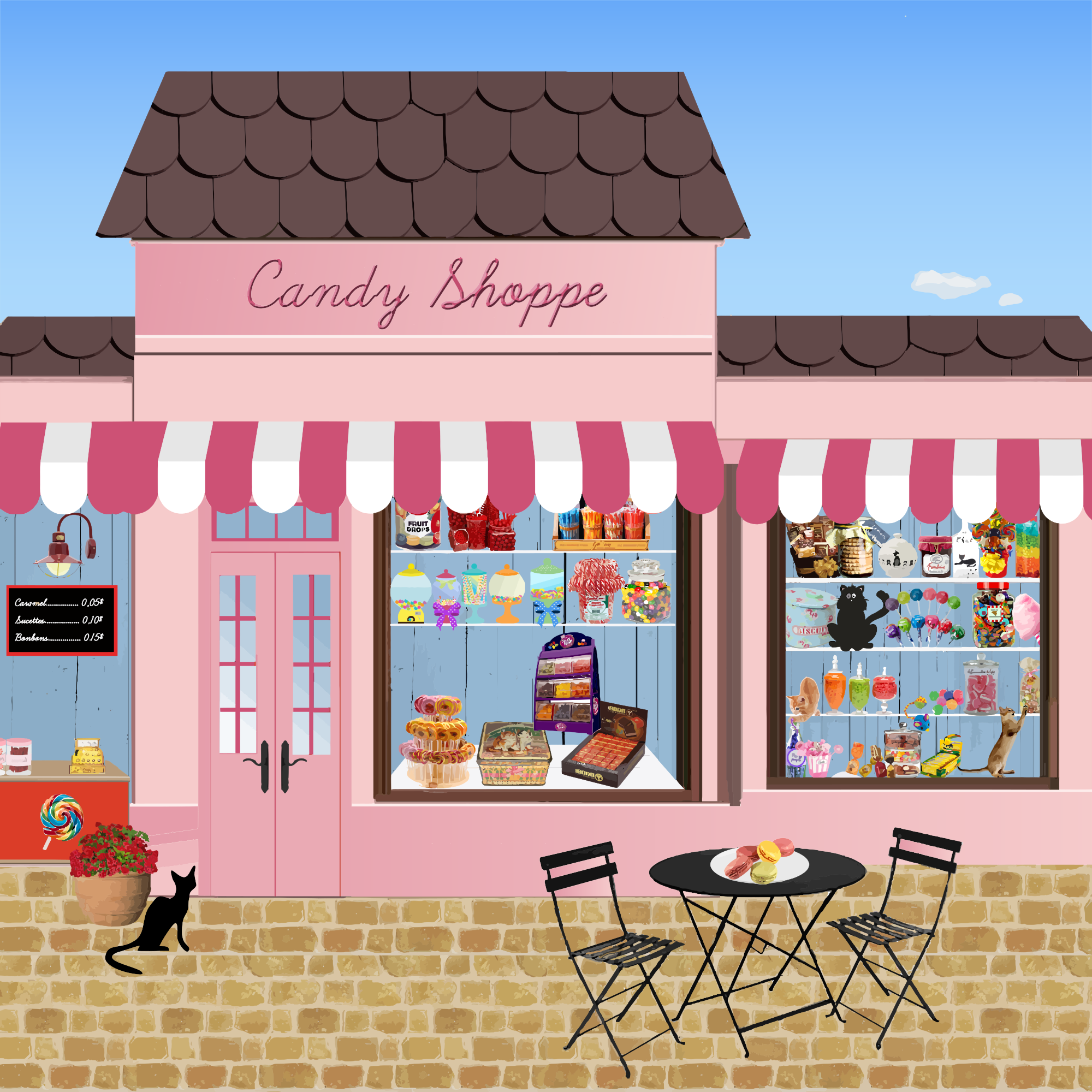This features a candy shop with a pink and brown roof, showcasing an array of colorful sweets in its window. A black cat is sitting outside the store, adding a touch of charm to the scene. In front of the store, there are two chairs placed on the sidewalk, inviting passersby to sit and enjoy the view or perhaps take a break from shopping. The overall atmosphere appears welcoming and delightful, as one would expect from a candy shop.