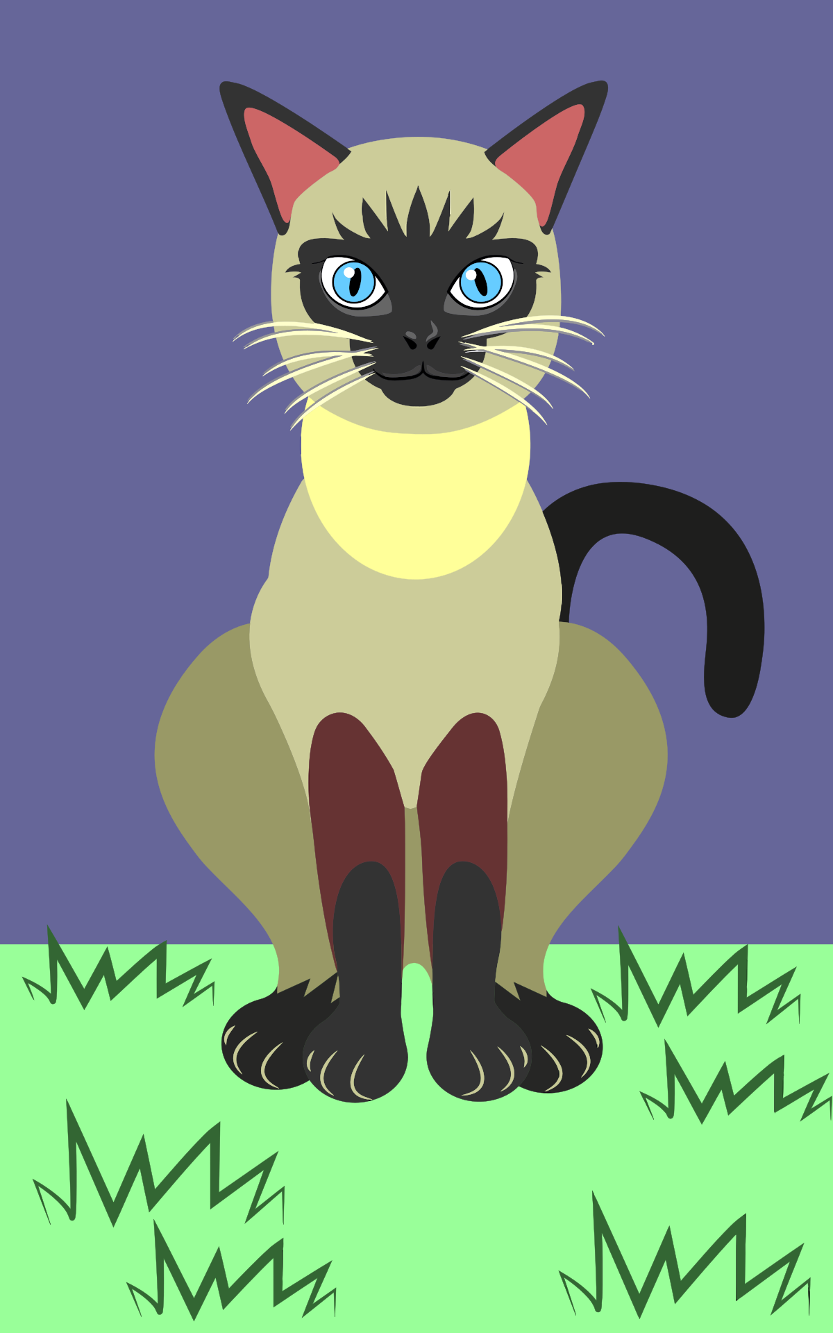 This features a Siamese cat sitting on the grass, with its tail wrapped around. The cat has a yellow body and black ears, whiskers, nose, mouth, and paws. Its eyes are a striking blue color, which adds to the cat's unique appearance. The cat is positioned in front of a purple background, creating an interesting contrast between the cat's colors and the backdrop. Overall, this image captures the beauty and charm of a Siamese cat in its natural environment.