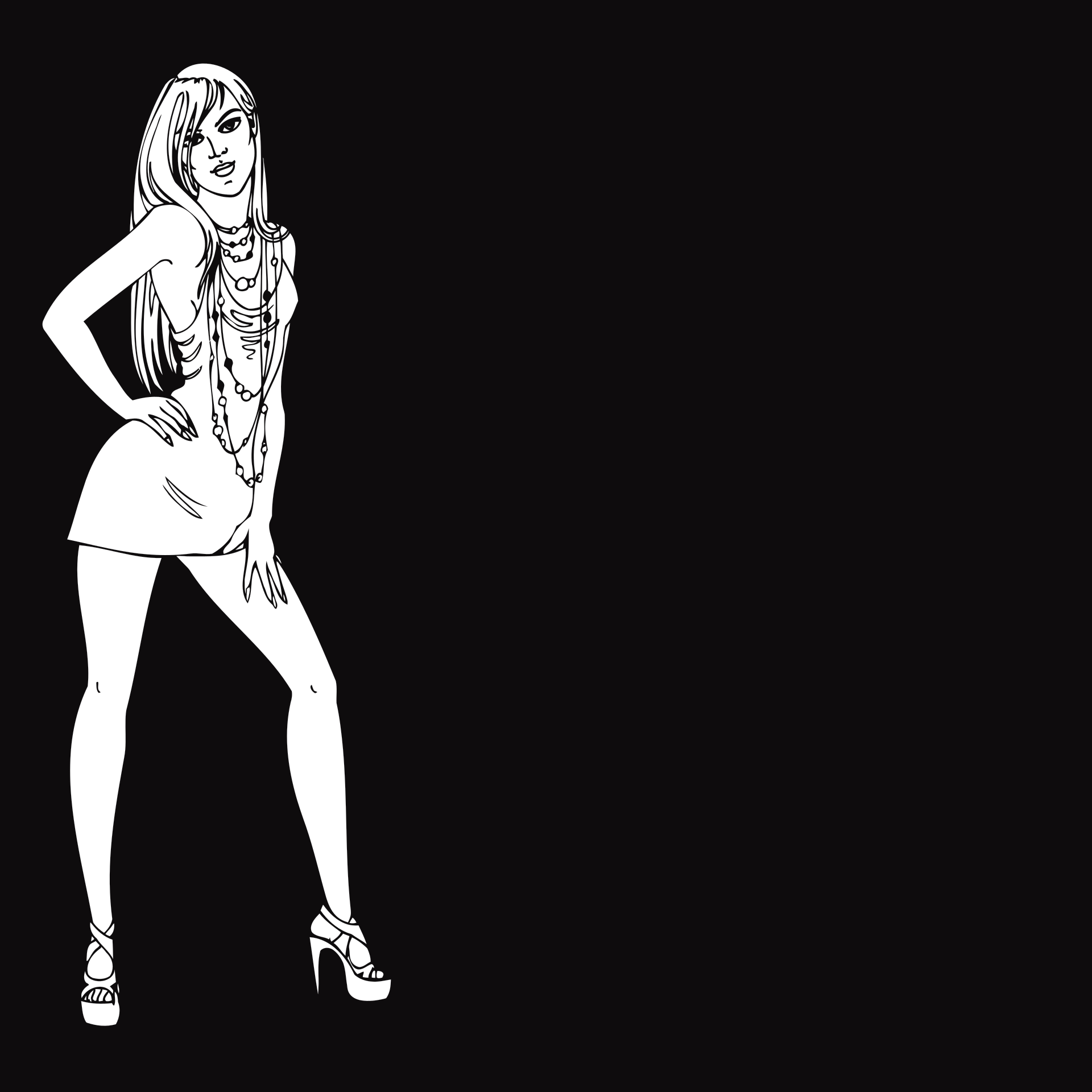 This features a woman in a white dress, standing with her hands on her hips. She is wearing high heels and has an air of confidence as she poses for the camera. Her outfit appears to be black and white, adding a classic touch to the scene. The background is dark, which further emphasizes the subject's presence in the image.