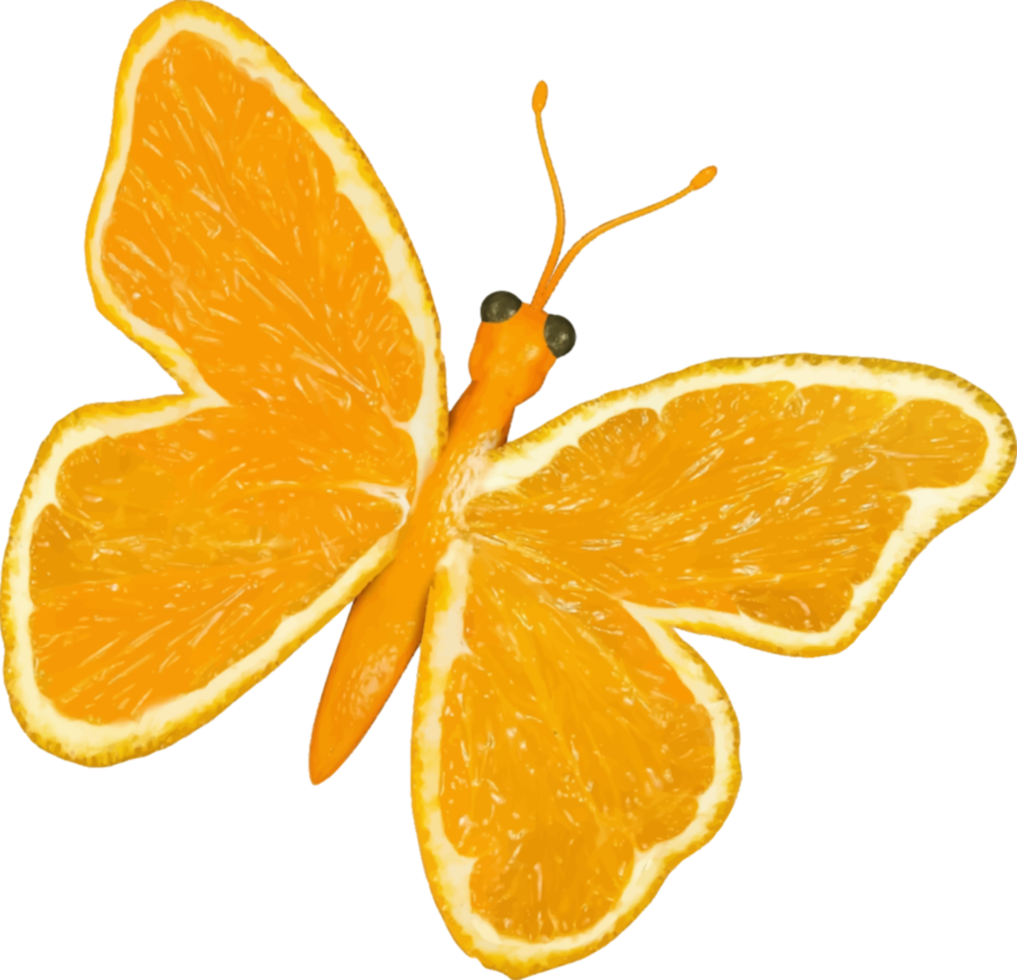 This features a unique and creative design of an orange butterfly. The butterfly's wings are made out of slices of oranges, giving it a distinctive appearance. It has blue eyes that add to its charm, and two orange antennae complete the look. This artistic representation of a butterfly is not only visually appealing but also serves as an interesting conversation starter due to its unconventional design elements.