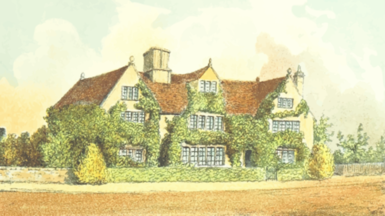 This features a large, old house with many windows. It is situated on the side of a road and has ivy growing up its walls, giving it an aged appearance. The house appears to be in need of some maintenance, as the ivy has taken over parts of the building. The scene is depicted in a watercolor style, adding a sense of nostalgia and charm to the image.