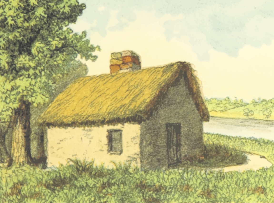 This features a small, old-fashioned house made of stone and covered with hay. It is situated in the middle of a field, surrounded by grass and trees. A large tree can be seen behind the house, adding to its rustic charm. The house appears to be an old cabin or shed, possibly used for storage or as a shelter from the elements. Its simple design and natural surroundings create a peaceful atmosphere, evoking a sense of tranquility and connection with nature.